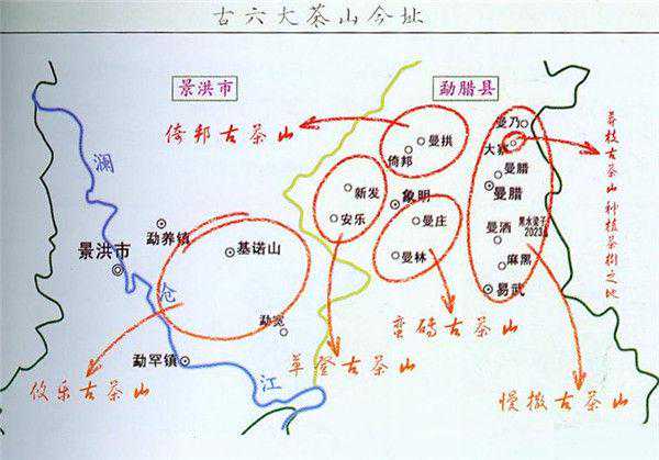 古六大茶山分别是:倚邦、蛮砖、攸乐(基诺)、革登、莽枝、漫撒(易武),现均属西双版纳傣族自治州,攸乐茶山现属景洪市,其余五大茶山均在勐腊县。其中,曼撒在易武乡,革登、莽枝、蛮砖、倚邦在象明乡。