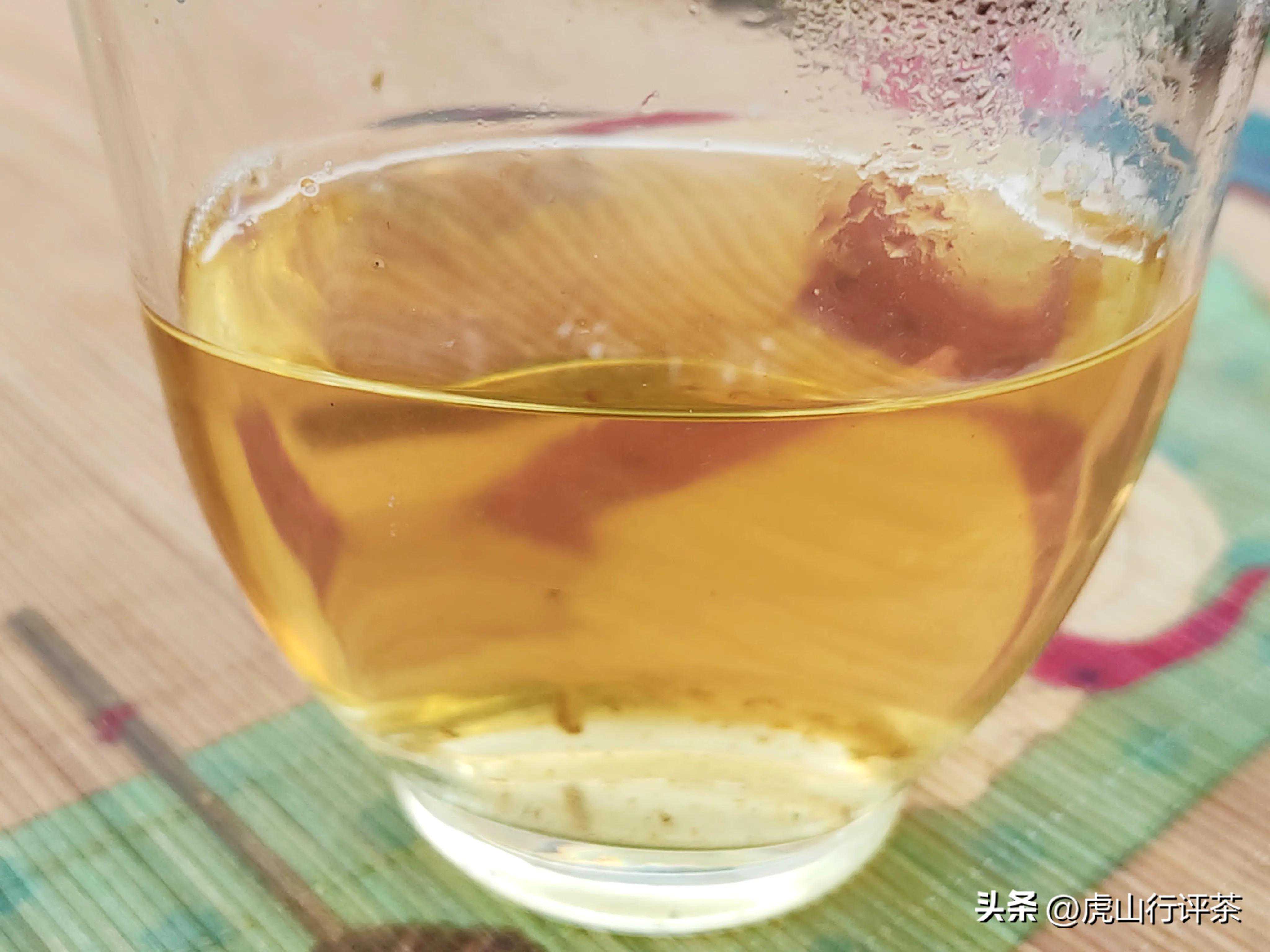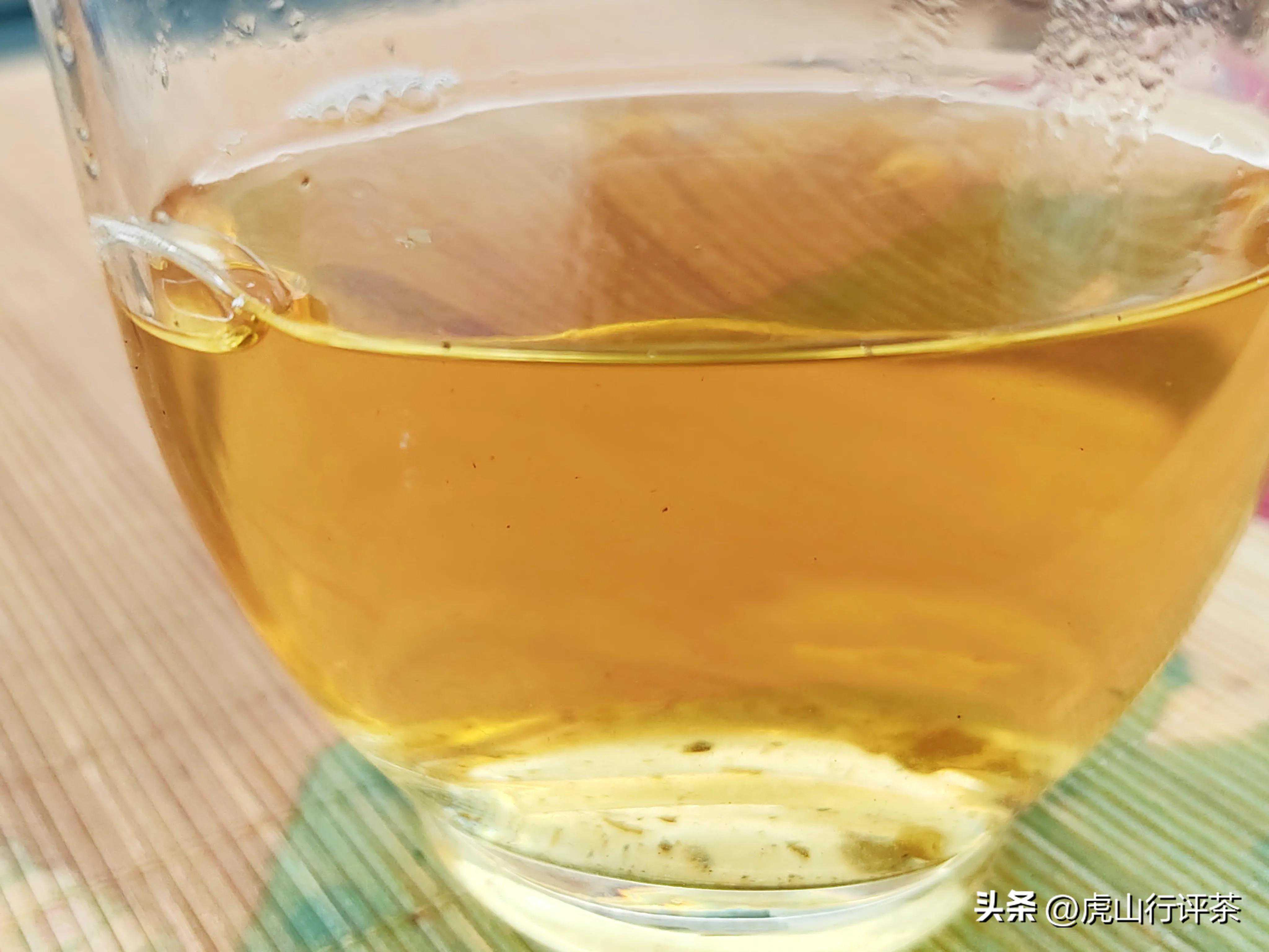 厚度略升,滋味更重,汤感的清晰度有一定下降,涩显。香气上烟香弱化,均衡感有所降低,生律回甘依旧较显,整体汤感延续,水路稍有粗砺、利落不改,喉韵茶气较显。回甘有甜度。