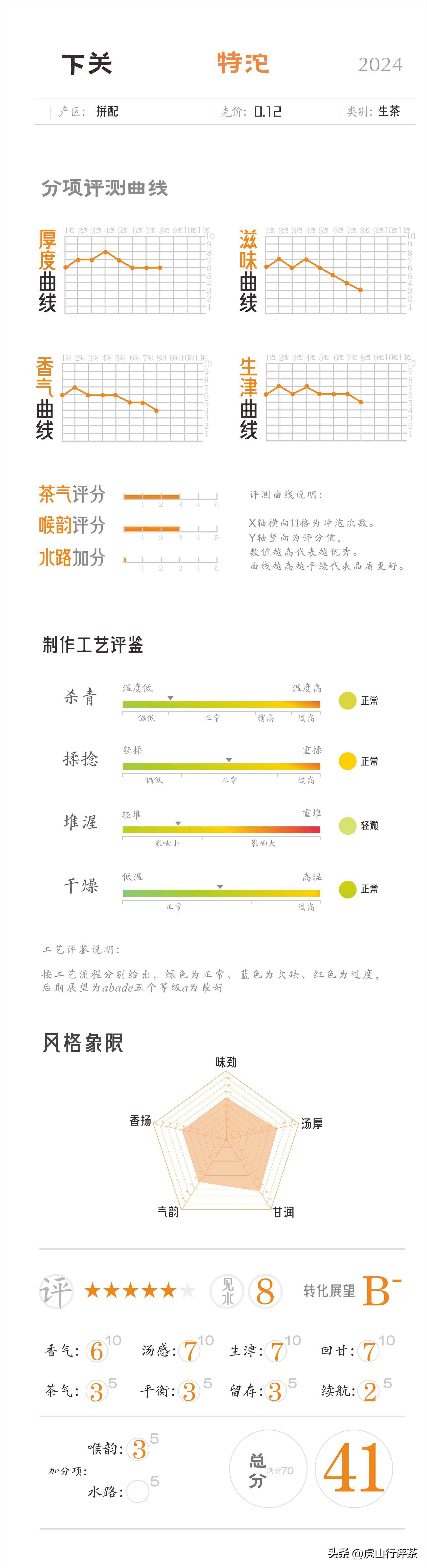 评测结果看这款2024下关特沱品质相比前两年有一定回升,烟味更明显,茶汤滋味更清晰,汤感更清冽。
