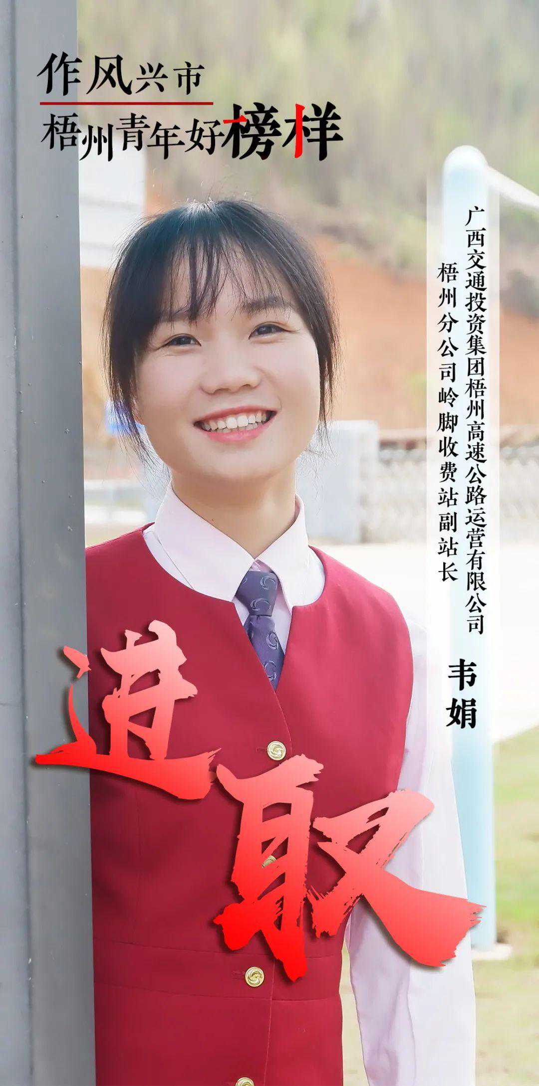 韦娟,女,壮族,1998年9月出生,共青团员,大学学历,广西交通投资集团梧州高速公路运营有限公司梧州分公司岭脚收费站副站长。她锐意进取,潜心钻研,坚持以过硬的业务技能为立足之本。2020年,面对新冠肺炎疫情,她冲锋在前、迎难而上,认真做好站区的疫情防控工作,她协助交警、路政对过往的17394辆车进行体温检测,坚决打赢疫情防控阻击战;在决战13天实车测试中,她担任分公司的后台统计小组组长,秉持着“发展交通,服务社会”的理念,带领同事们攻坚克难,充分发扬不怕苦、不怕累的精神,连续4天通宵达旦,共完成大数据1746张记录表和5265张图片资料的整理填报工作,最终顺利完成8个“一票否决”后台核验、现场实车测试、ETC投诉工单和退费工单双清零等工作。
