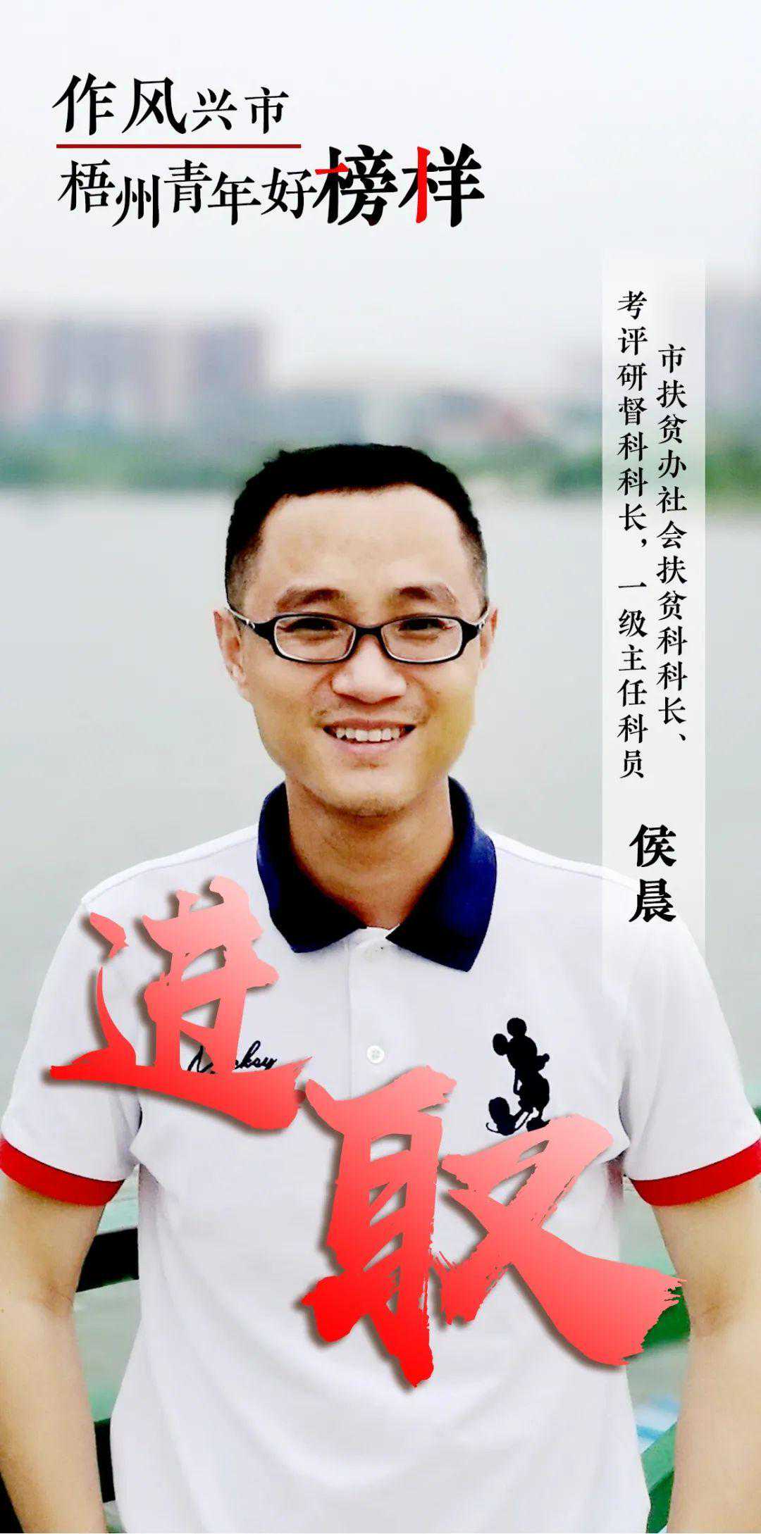 侯晨,男,汉族,1986年8月出生,中共党员,大学学历,市扶贫办社会扶贫科科长、考评研督科科长,一级主任科员。他恪尽职守,心系群众,是脱贫攻坚战场的“排头兵”。他有7年的扶贫工作经历,尽心尽力的奉献,成长为一名脱贫攻坚工作的“多面手”。他注重发挥考评研督和社会扶贫、行业扶贫助推脱贫攻坚作用,建立起全市扶贫成效考核体系和督查、协调、通报3项制度,组织完成对全市4个贫困县267个贫困村脱贫摘帽初审及公告退出,并创新思路组织193个定点帮扶单位开展“一帮一联”工作。在全市策划开展了消费扶贫、百企扶百村、脱贫感党恩奋进新起点等系列活动。协调建成消费扶贫专区24个、专馆13个,组织171家供应商338个特色农产品获得国务院扶贫办扶贫产品认证。协调自治区级以上媒体宣传报道全市脱贫攻坚620篇次,讲好梧州脱贫故事。