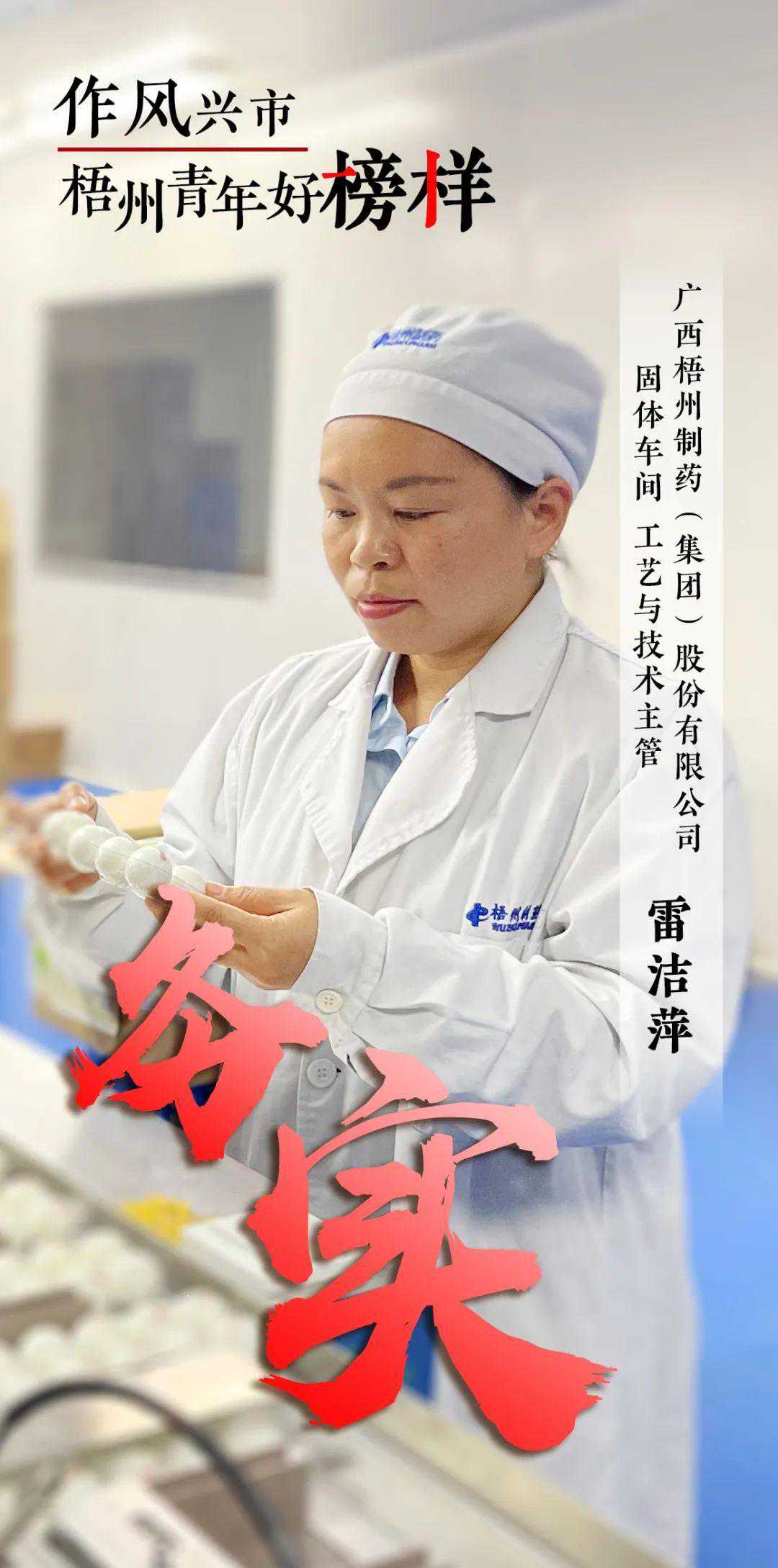 雷洁萍,女,汉族,1987年11月出生,中共党员,大学学历,广西梧州制药(集团)股份有限公司固体车间工艺与技术主管。“遇事不服输,做事要坚持”是她的人生信念,“追求团结协作,懂得感恩他人”是她的工作态度。2018年至今,雷洁萍牵头全面修订60多份岗位操作规程、设备清洁消毒规程,使工作标准文件更具针对性和指导性;对丸剂、茶剂、中药散剂、颗粒剂近30个品种的批生产记录按要求进行改版,对原版记录存在缺陷的地方重新设计,使生产记录更加规范,有助于生产操作的正确填写。凭借专业的能力和一丝不苟的严谨工作态度,她慢慢成为业务上的一名骨干,成为“传帮带”和以身作则的表率。2020年,她负责的“提高大蜜丸类优级品率”QC改进成果分别荣获广西质量管理小组活动一类成果、全国QC小组成果发表专业级奖;在2020年全区职工职业技能大赛质量改进项目决赛中荣获第二名。