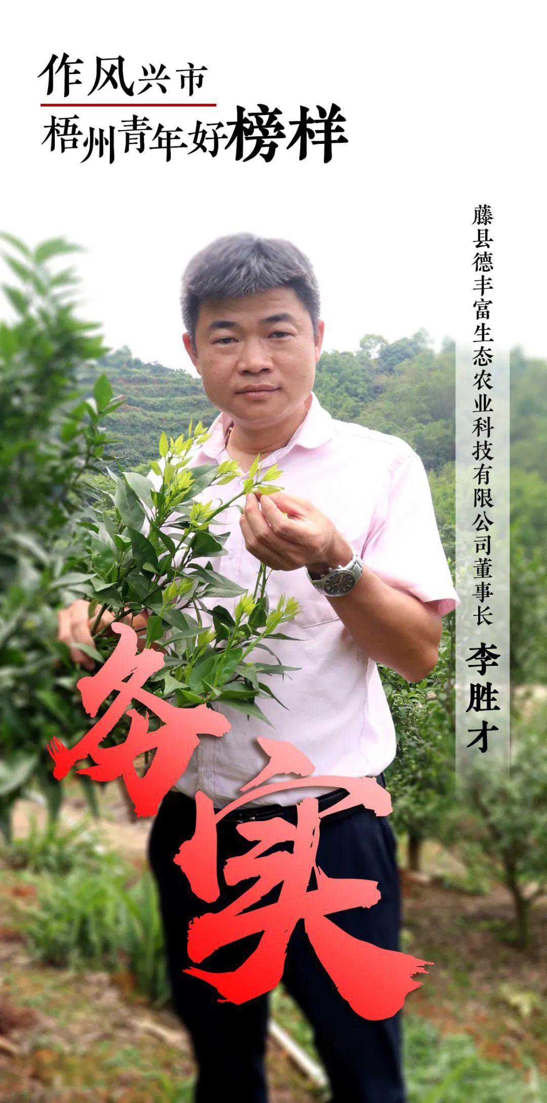 李胜才,男,汉族,1984年6月出生,大专学历,藤县德丰富生态农业科技有限公司董事长。他是农村青年致富带头人,为乡村振兴助力,为果农增产增收奋力拼搏。专注于“三农”服务,他在藤县推出创新的柑橘一年半挂果种植技术,实现果树早挂果,早丰产,早收益,早脱贫的经济效益,带动4000亩果园约300个种植户60多户贫困户从种植果树零技术到通过培训快速掌握高效丰产的柑橘种植技术,有效助力当地脱贫攻坚工作,并利用京喜线上销售平台进行直播带货销售。曾获中国农业技术推广协会年度柑橘种植大王、种植户百优终端服务商、广西百佳农技实战专家、2019年梧州市青年创业创新大赛总决赛二等奖。