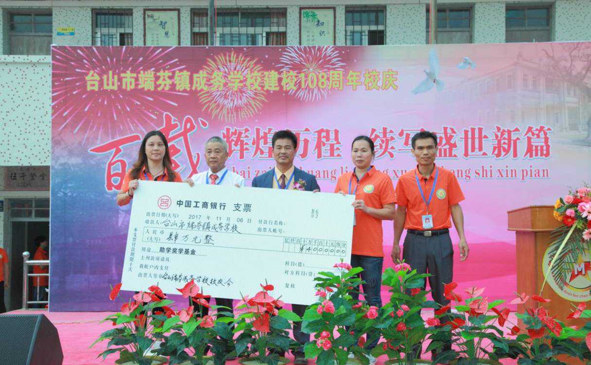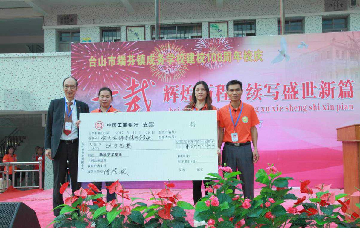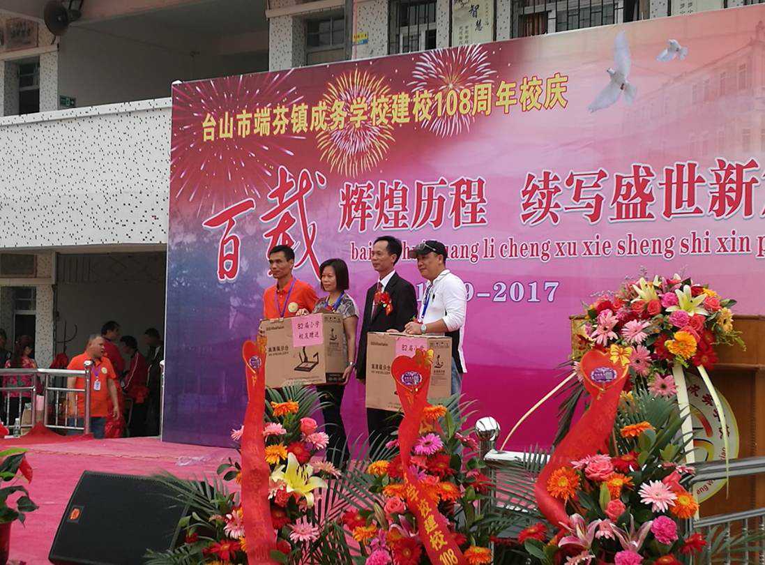 2017年11月6日,广东新闻广播“大爱有声·走进台山市瑞芬成务学校”,来自海内外近1000名成务学子以及各界人士济济一堂,共同庆祝台山市端芬成务学校建校108年校庆。在活动现场,昔日学子分享了当年的求学经历,感恩学校的栽培并用现金或物资等方式继续支持学校的发展。
