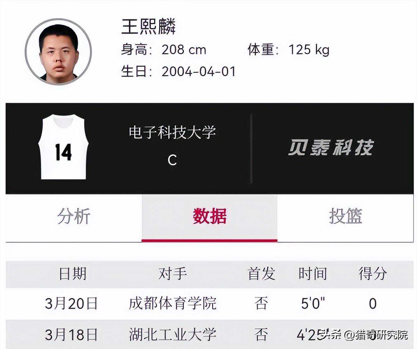 在电子科大队与湖北工业大学的这场比赛中,王熙麟替补出场4分25秒,仅仅拿到了两个篮板。