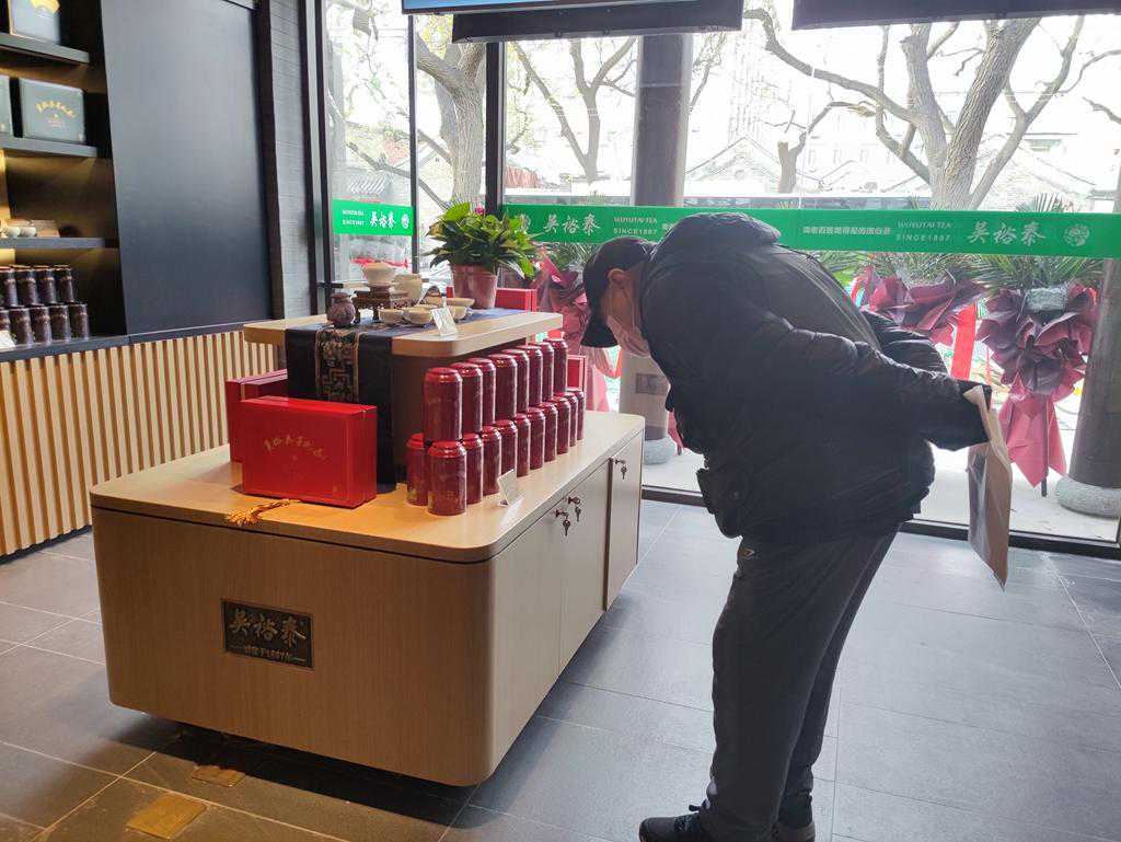 昨天上午,吴裕泰北新桥总店门前摆满了喜庆的红色花篮,店内前来购物、体验的市民络绎不绝。“装修完真是焕然一新,服务员的态度特别也好。”82岁的杜大爷家住东四十二条,他在这家店买了70多年的茶叶了。听说吴裕泰重新开业,杜大爷和老伴儿特意过来瞧瞧,“我一般都喝这家的茉莉花茶,就好这口儿。”杜大爷说。