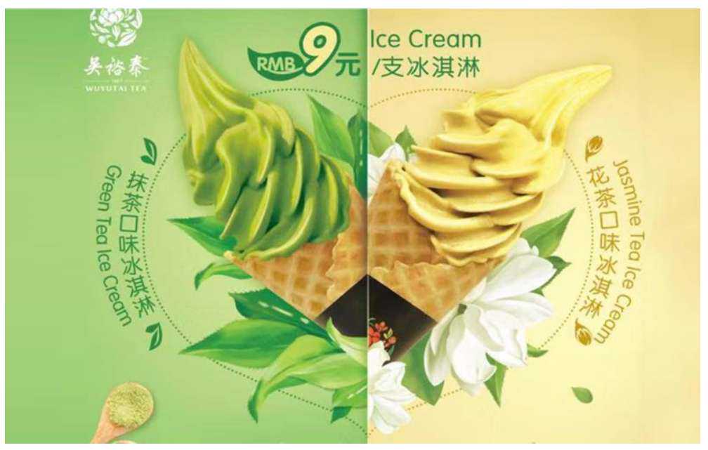 花茶冰淇淋:如果说抹茶冰淇淋是海底的细沙,那么花茶味的冰淇淋就是海面上的浪花。这个花茶冰淇淋取了吴裕泰家最具特色的茉莉花茶的口味,入口是沁人心脾的清香,就像茉莉花的精灵在舌尖上跳舞,是一种悠远的味道。