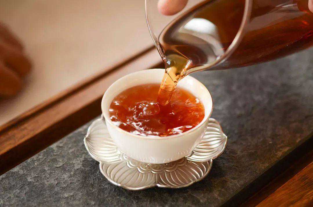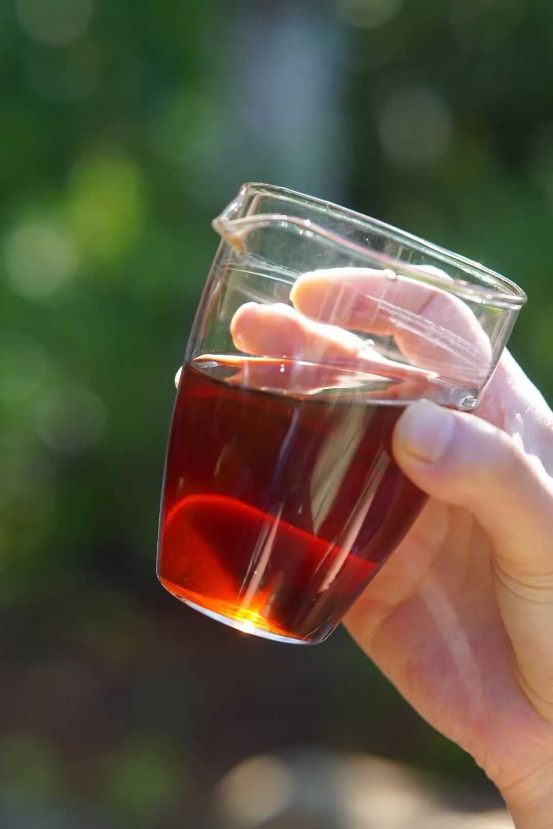 3、再看一下它的汤色,这个汤色是红浓明艳的,它的茶汤里面没有沉淀物在悬浮,没有其他杂物在漂浮。不暗沉,不浑浊。
