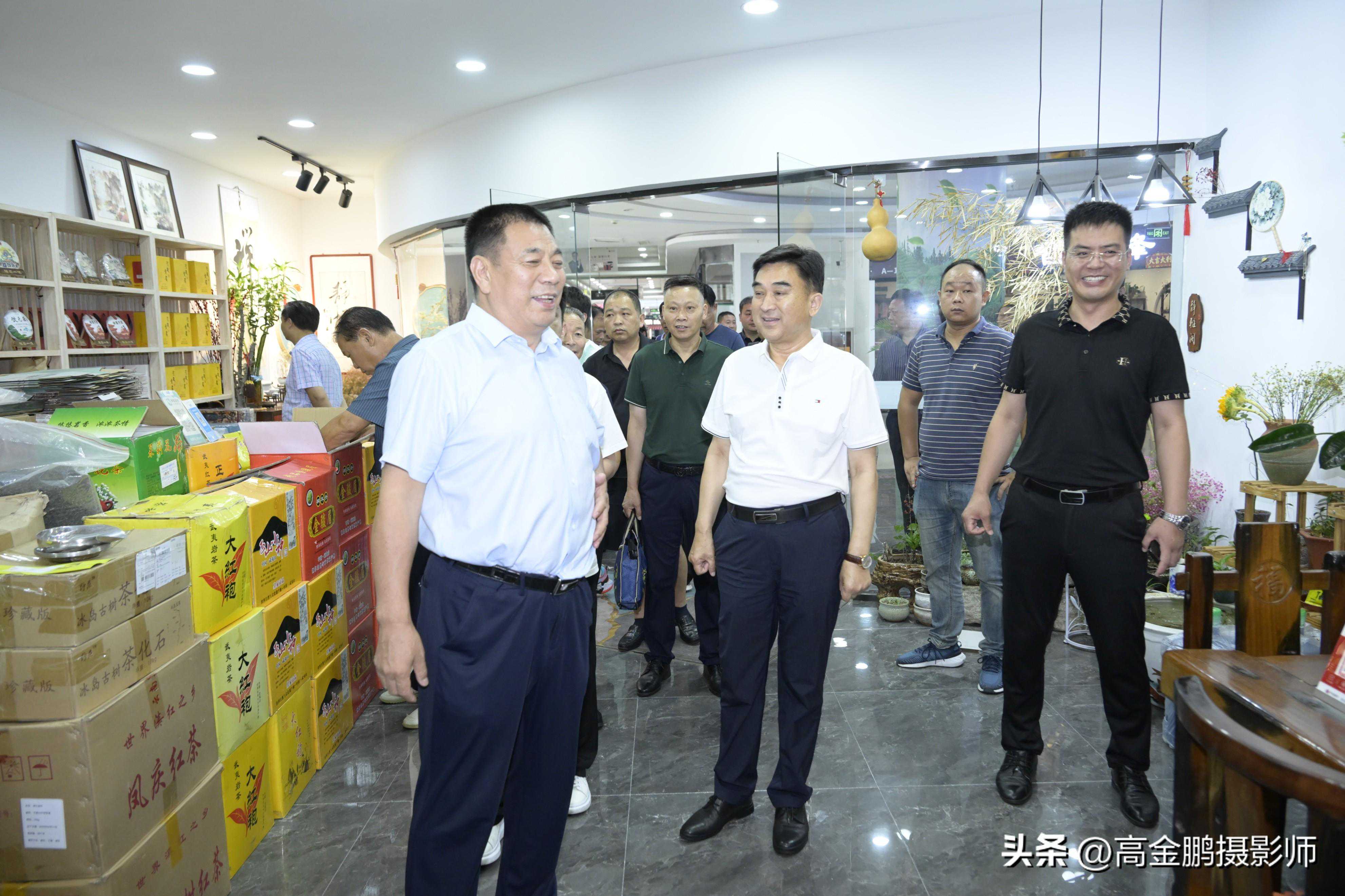 梁记朝会长、副会长兼秘书长王志、副会长刘淑敏、安首虎等协会领导陪同十堰市武当山茶产业品牌联盟主席、十堰市茶叶品牌运营管理有限公司董事长王大明;十堰市农业农村局果茶专班负责人张岚;武当山茶联盟副秘书长高兵等十堰市有关部门、协会和代表性企业负责人考察老佳农茶城。