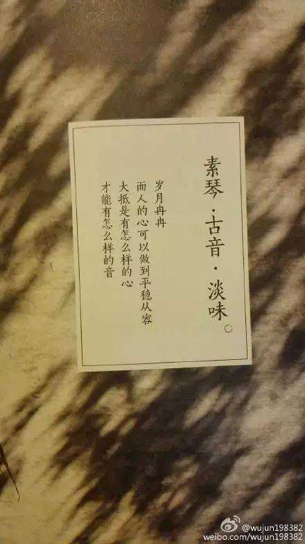 @wujun198382:今日阴雨迷蒙,阴冷下午雾霾凝重,得清闲觅一处茶室静心看书。看完《得未曾有》的最后一章,关于古琴,传承体悟于师者言谈举止,文字优美,让我这个不通音律者从字里行间品位琴声悠扬,感触其雅韵而反复默念,心生仰慕自觉当修身养性,寻得心中欢喜坚持修炼,颐养心性戒骄戒躁,但求有所感悟内心向往。