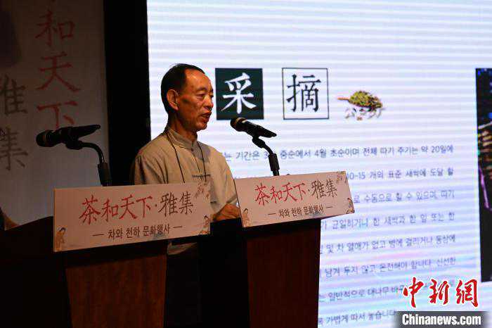 图为安吉白茶制作技艺非遗代表性传承人严荣火进行讲座。首尔中国文化中心供图