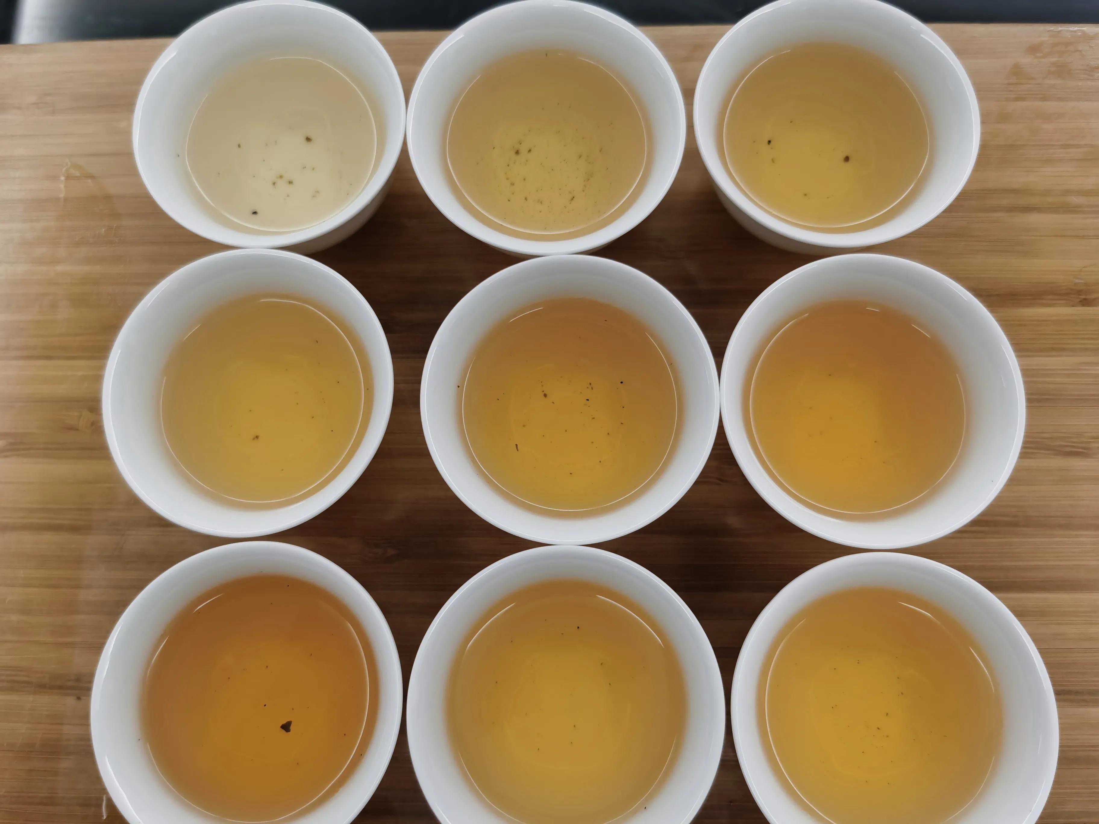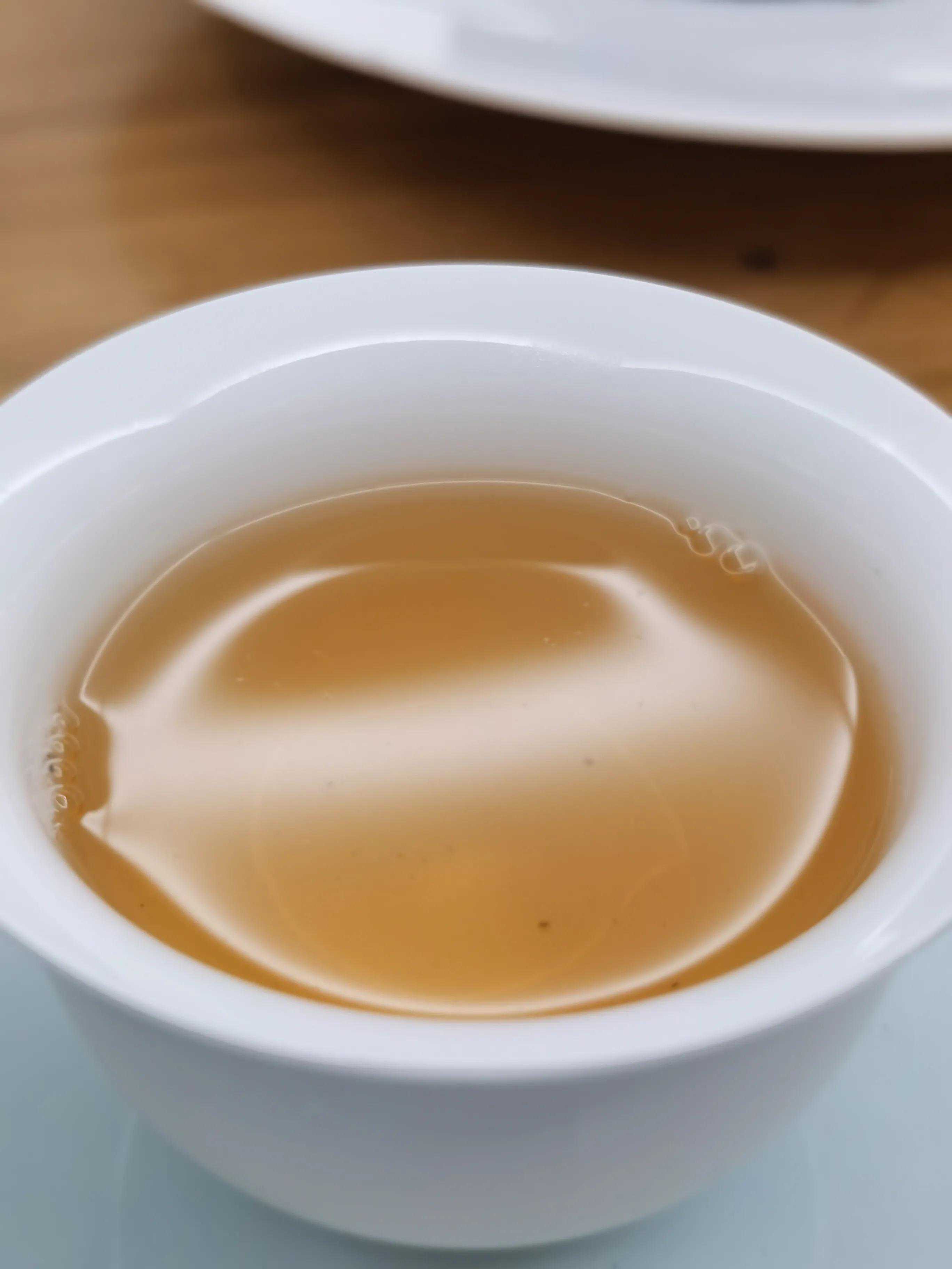 厚度稍降,苦底下降明显,滋味总体趋势向下,汤感柔和,饱和度不错,生津收敛,回甘反而更明显了。