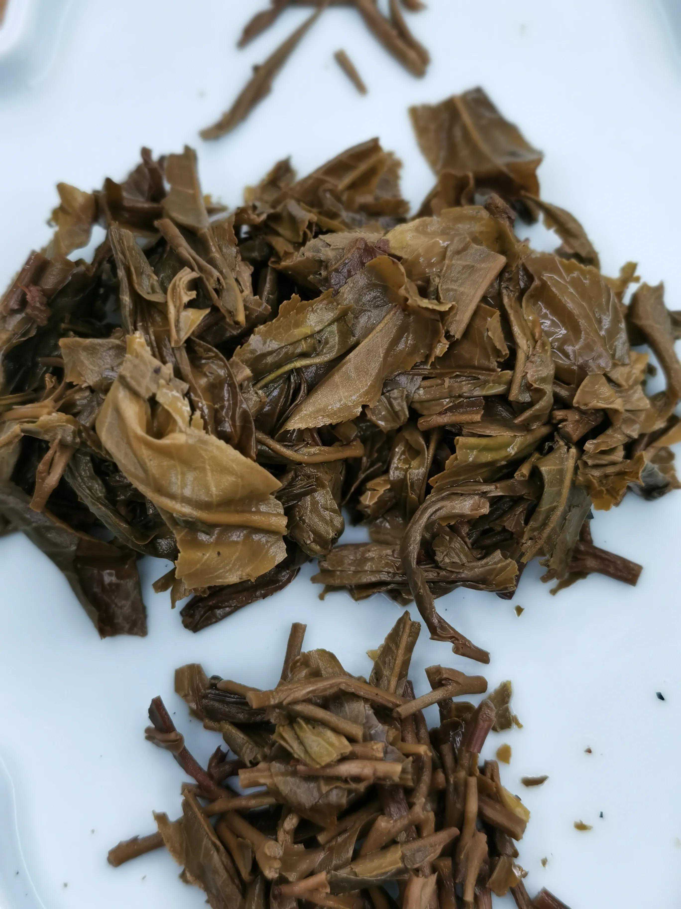 看茶底,芽料比较少,叶梗料比较多,大叶种茶底明显,总体用料还算不错,有明显新陈梗拼配痕迹,看叶底同时可以看到略有轻揉、重凋、堆渥痕迹。