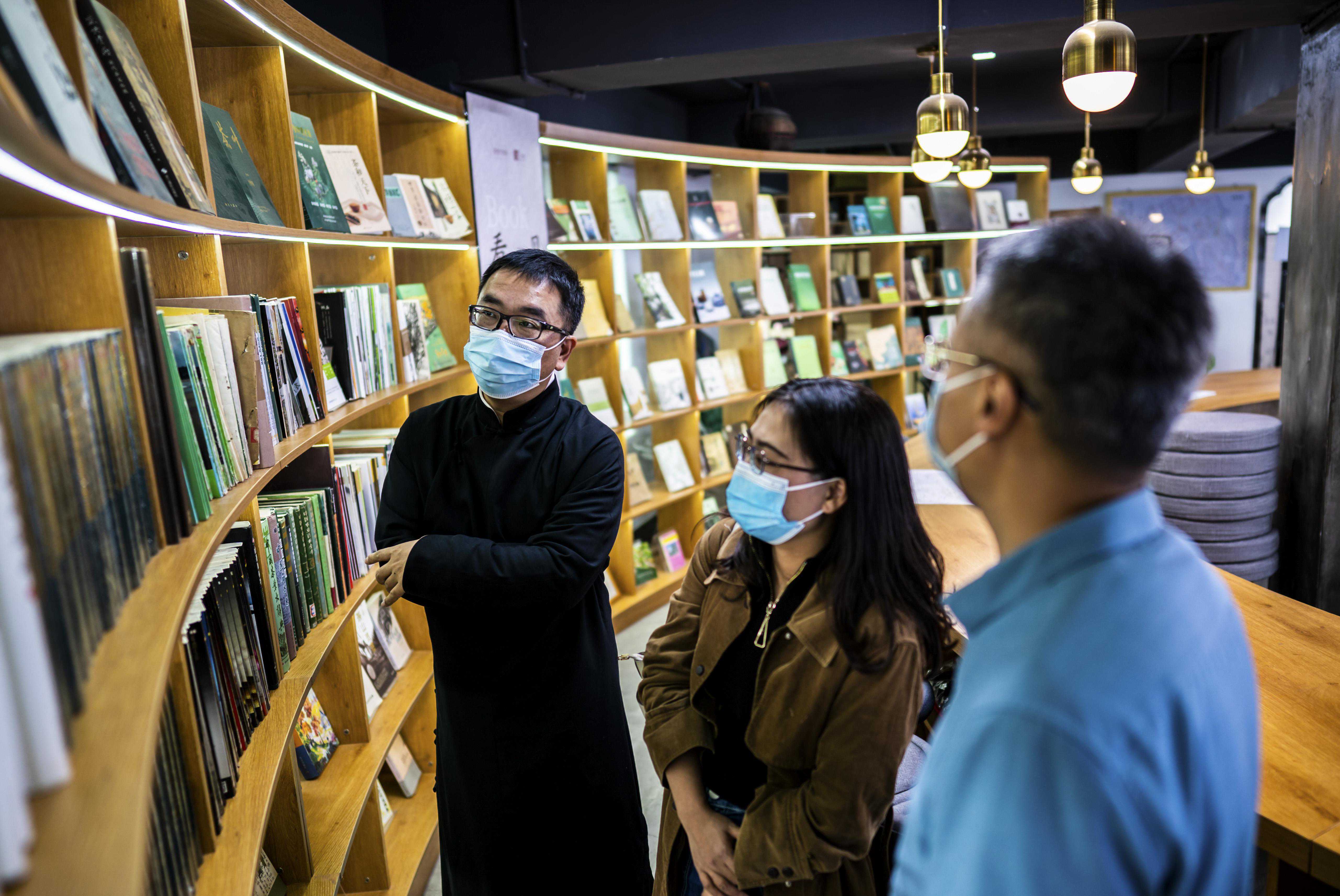 周重林在书店为顾客介绍茶书(4月21日摄)。新华社记者江文耀摄