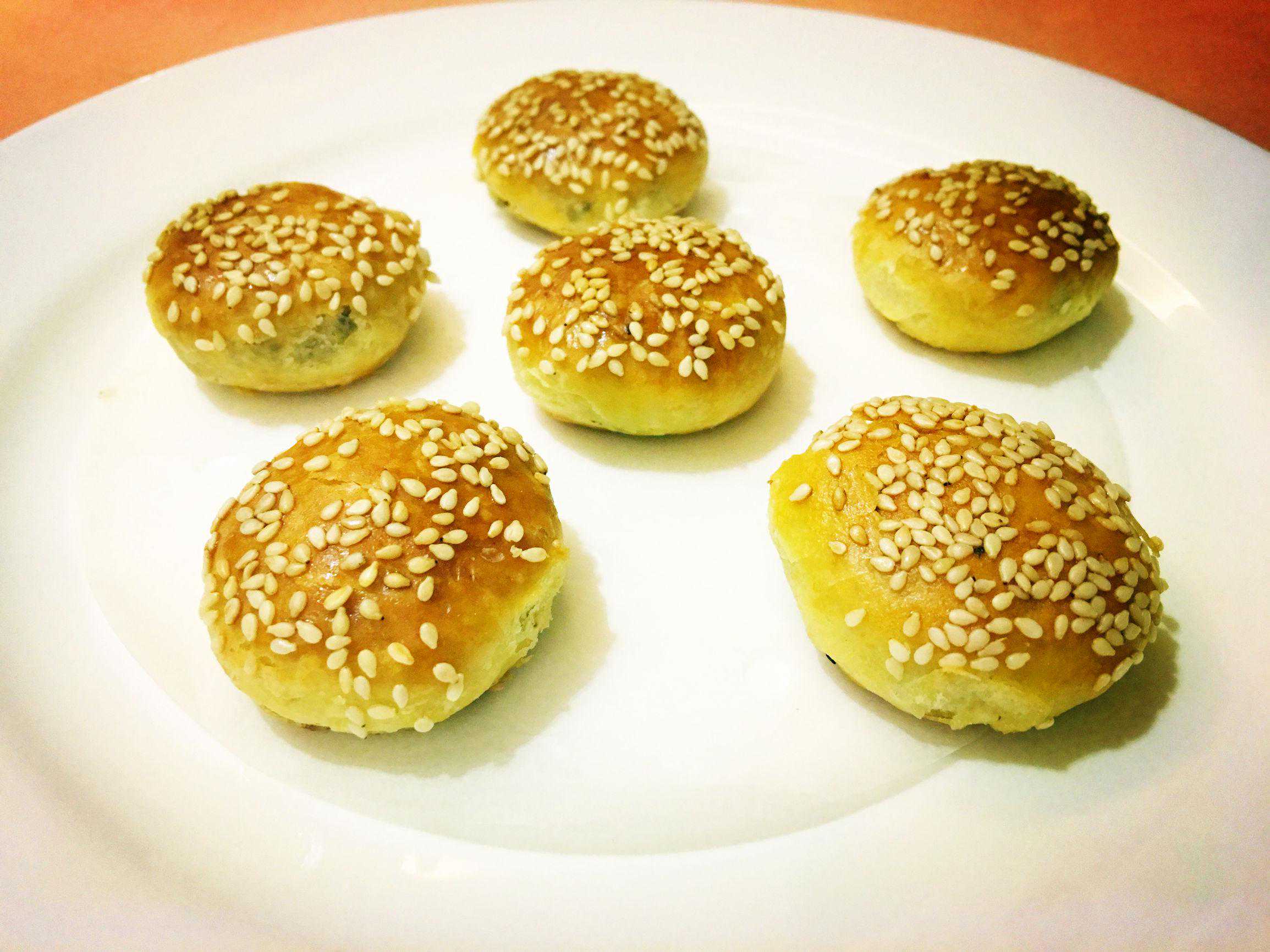 ◆蟹壳黄烧饼:将梅干菜和鲜肥肉丁包裹在饼内用炭火烤成