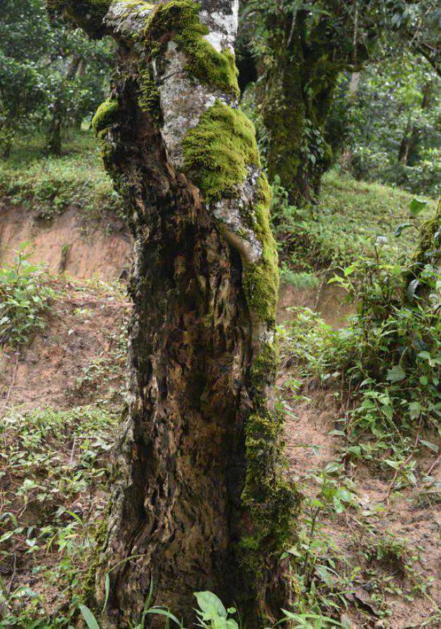当地人说,古茶树雷劈劈不死、野火烧不死、蚁虫害不死、刀斧砍不死。顺着斧头留下的痕迹,古茶树改变了自己向上生长的路线,一扭头横向而去,之后再分枝向阳而去。