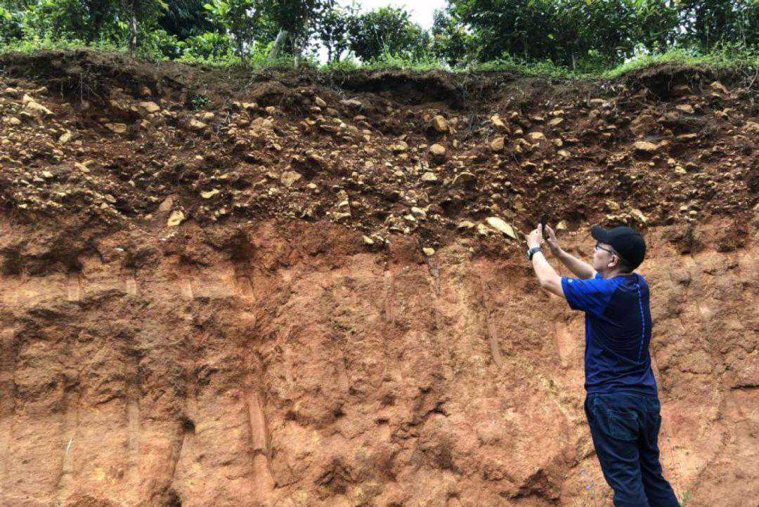 保塘这片茶园里因为修路,挖出了土壤的切面。我们得以直观观察到茶树根系和土壤的构成。
