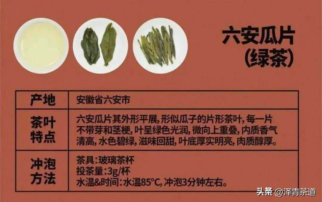 六安瓜片产自安徽省六安市大别山一带,唐称“庐州六安茶”,明朝始称“六安瓜片”,为上品、极品茶,因茶叶形似瓜子而得名,自然平展,叶缘微翘,色泽宝绿,大小匀整,不含芽尖、茶梗,清香高爽,滋味鲜醇回甘,汤色清澈透亮,叶底绿嫩明亮。