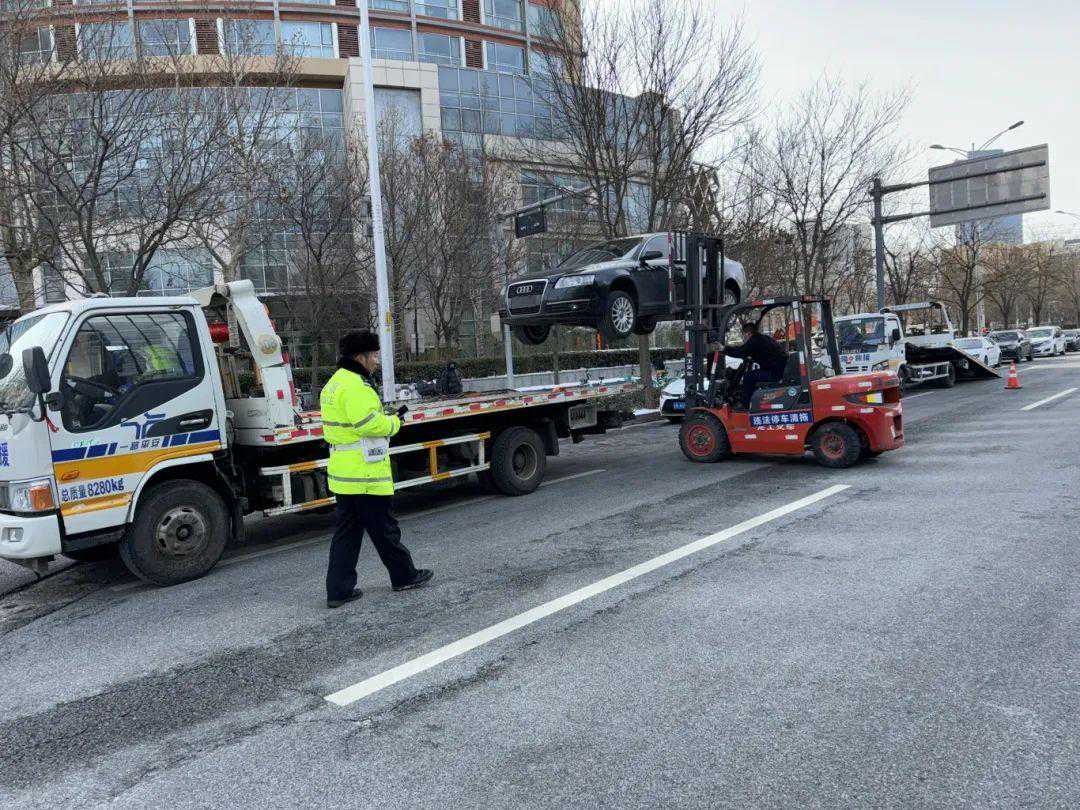 最终,它被拖移到指定的停车场,违法行为人因违法停车和未悬挂机动车号牌上道路行驶的违法行为,将面临罚款400元处罚,驾驶证记9分。