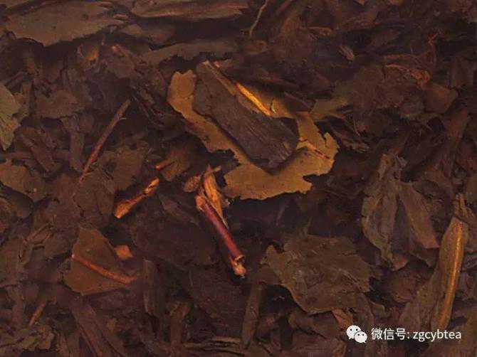 叶底色泽黑褐有光泽,叶片粗老,叶质硬,含较多梗,尚匀整。