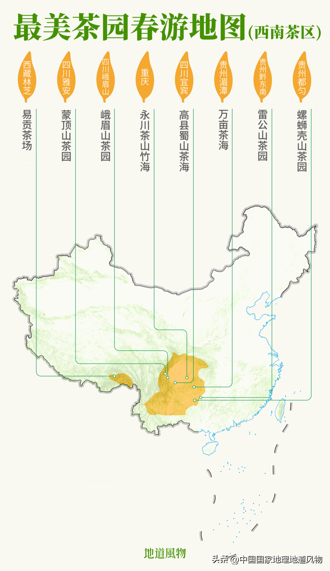 以这样的初衷,中国国家地理·地道风物联合喜茶、中国茶叶流通协会、飞猪旅行,在这个春天联合发起“喝第一口春茶”最美春茶园喜悦茶生活征集活动。希望结合喜茶及新茶饮这种年轻群体更喜欢的茶文化表达方式,邀请大家拿着我们制作的这张“中国最美茶园春游地图”,去各地茶园感受中国最美的春天,用更年轻的方式展示中国茶的魅力。