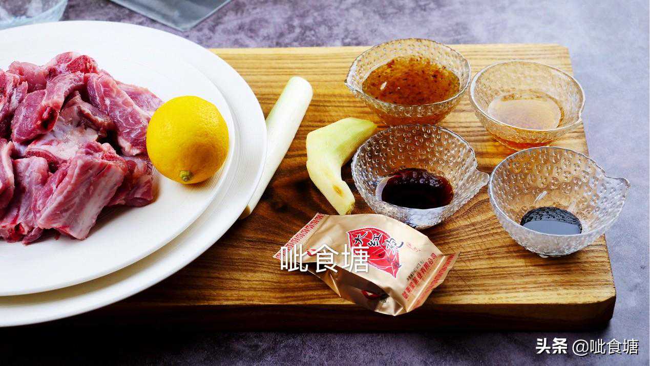 1,材料:猪肋排,大红袍,桂花糖,柠檬,葱姜,料酒,生抽,老抽