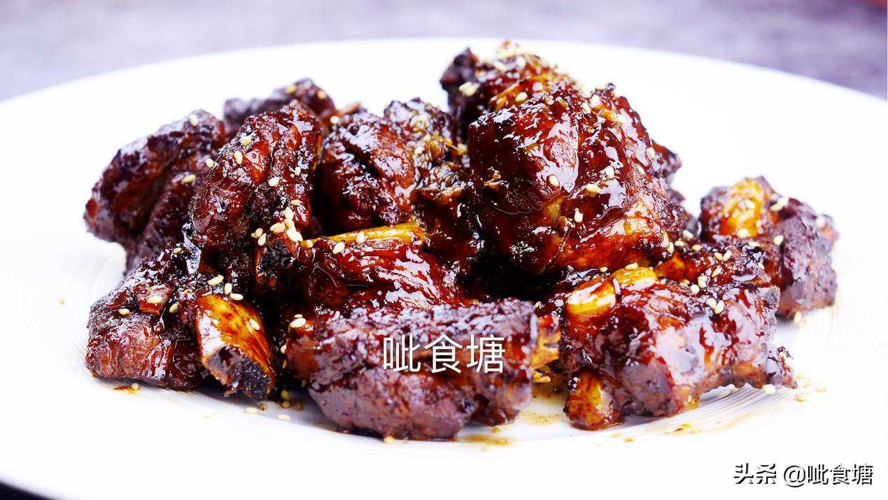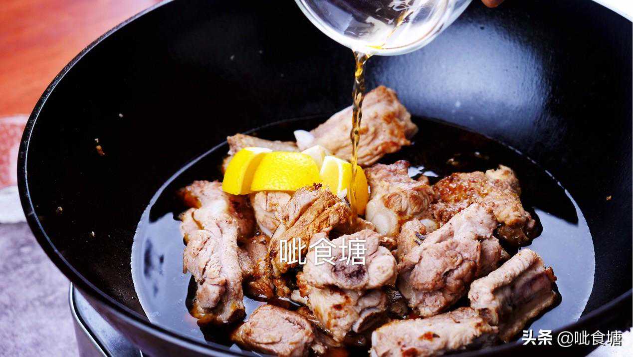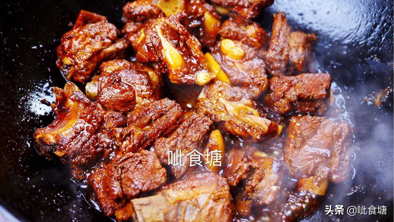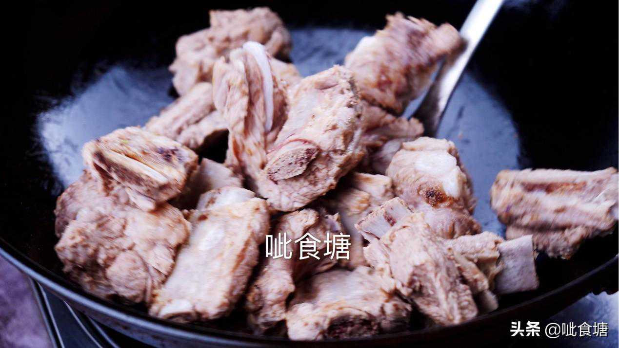 4,不油腻的关键在这一步,焯过水的排骨,干锅炒制表面微微焦黄。干锅不放油哦,直接炒,没有额外的油添加,所以成品非常的好吃不油腻。你可能会问,既然要炖,那还炒它干啥?这里的目的就是为了让排骨定型,最后成品形状会更加的好看。还有经过高温炒制,表面微微焦黄会让肉香更加的浓郁。而且排骨虽然脂肪含量不高,但也会有点,高温会析出一部分脂肪在锅里,这也让最后收汁的时候汤汁会更浓稠鲜亮好看。