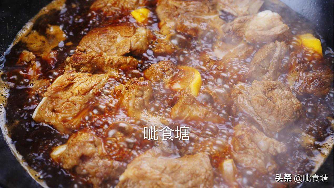 6,小火焖煮30-40分钟。烧排骨要的是相对有嚼劲的口感,而不是软烂。因为排骨肉和挂满表面的汤汁会越嚼越香。只要排骨能脱骨就可以。