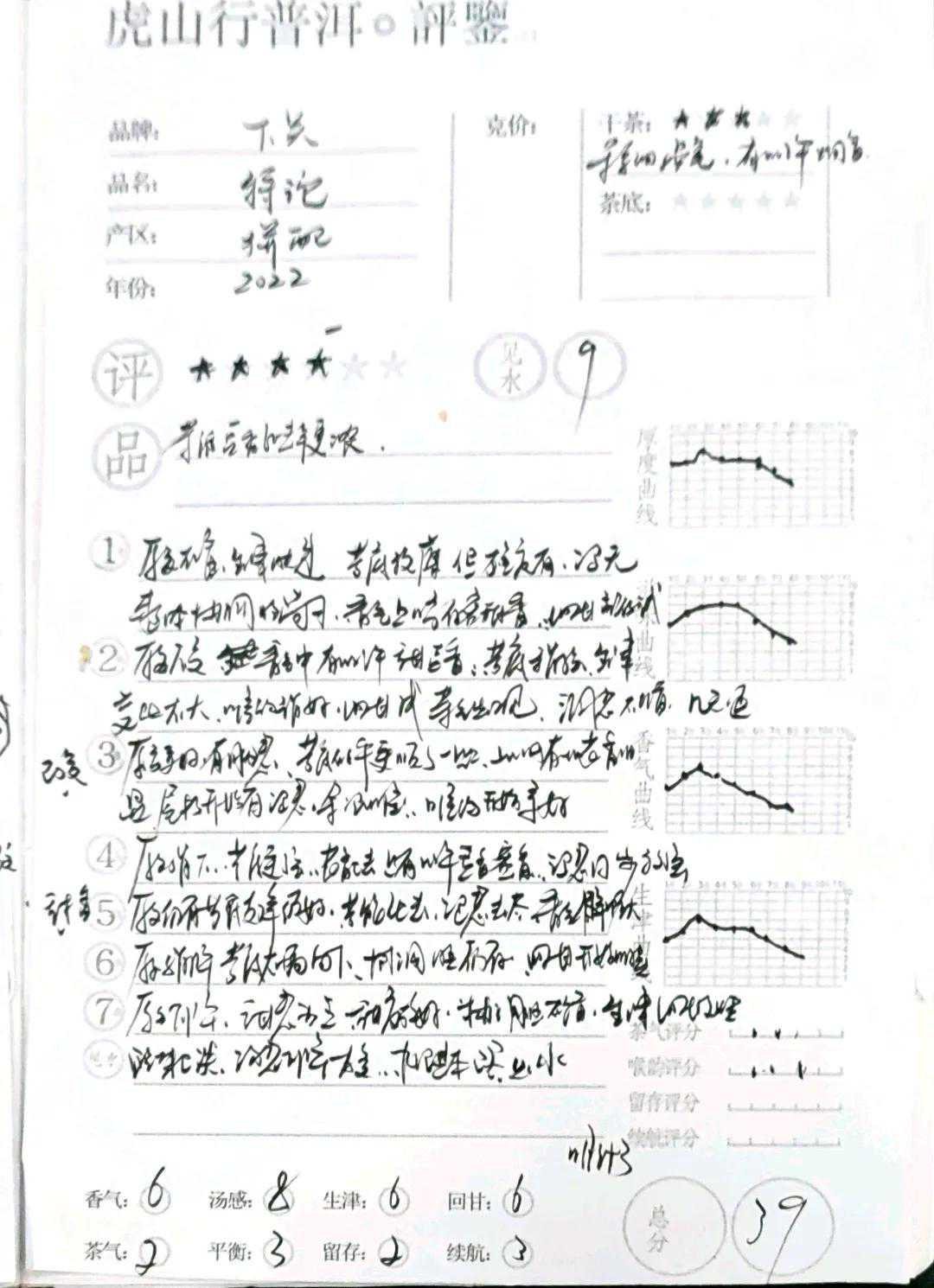 综合评价:得分39评星四星-总体看此茶在前几泡各方面都有相对均衡的表现,汤感厚实,前中段表现稳定,香气前段表现尚可,中后段则下降太快。苦底强度与支撑也还不错,涩感中段明显。生津喉韵也有延续性不错的表现。