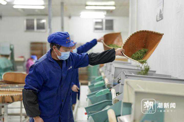 茶工正在筛选新鲜、嫩绿的茶叶,并去除杂质和小虫子。