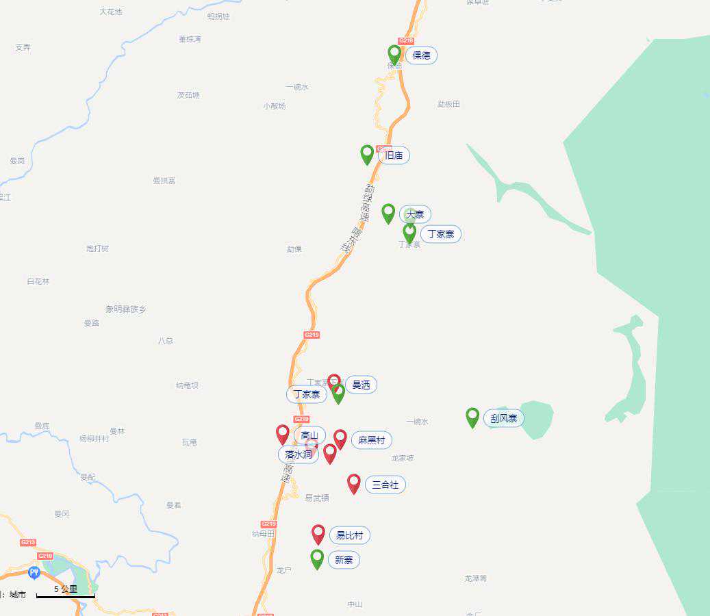 七村是指:麻黑村、高山村、落水洞村、曼秀村、三合社村、易比村、曼洒村;