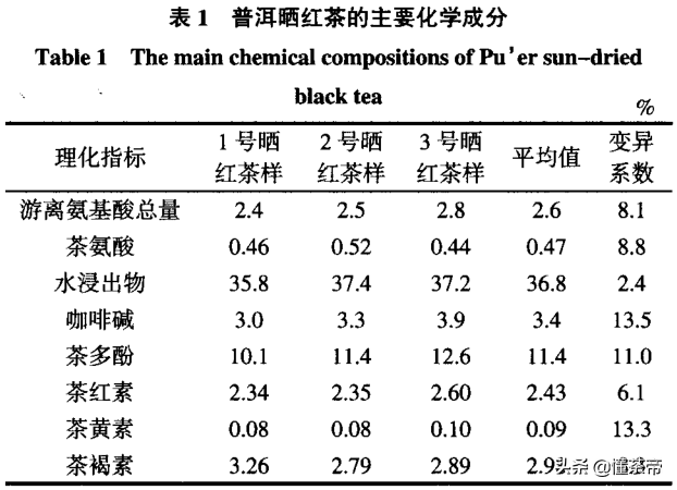 普洱晒红的水浸出物含量均值为36.8%,滇红为36.82%,二者非常接近,几乎没有区别,证明大叶种红茶内含物质都很丰富。