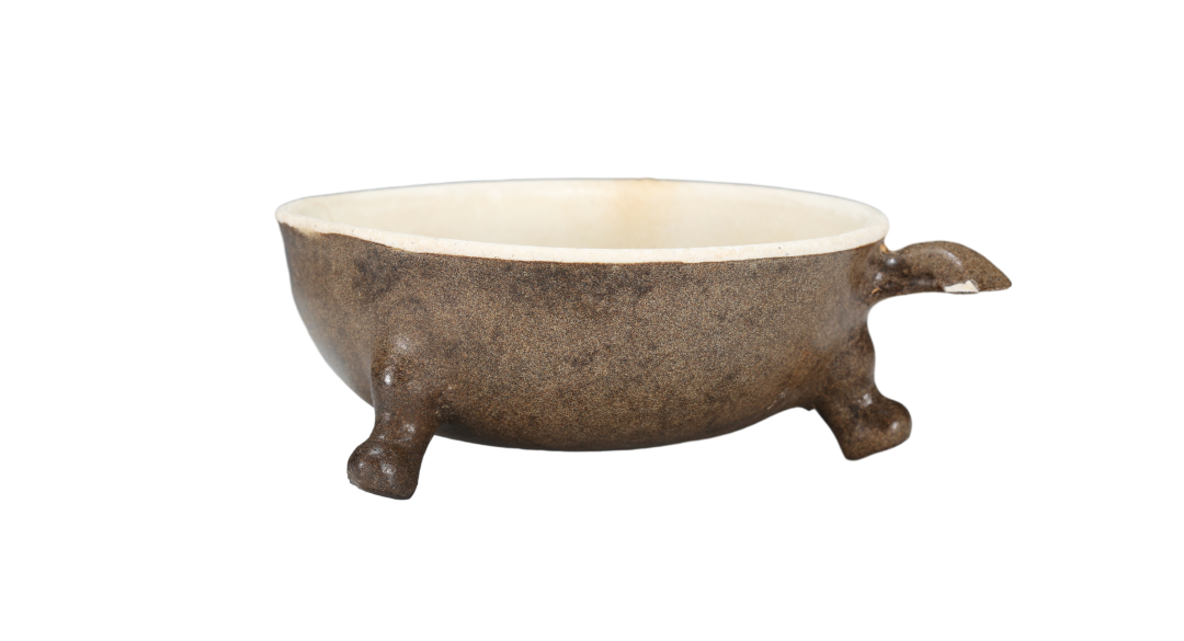 巩县窑位于河南巩县,是唐代重要的窑口,烧造品种丰富,除了白釉、黑釉、黄釉器外,还有著名的三彩器。此茶铛的独特之处,在于外茶叶末釉、里白釉的组合施釉法,在巩县窑同类器中也属少见。