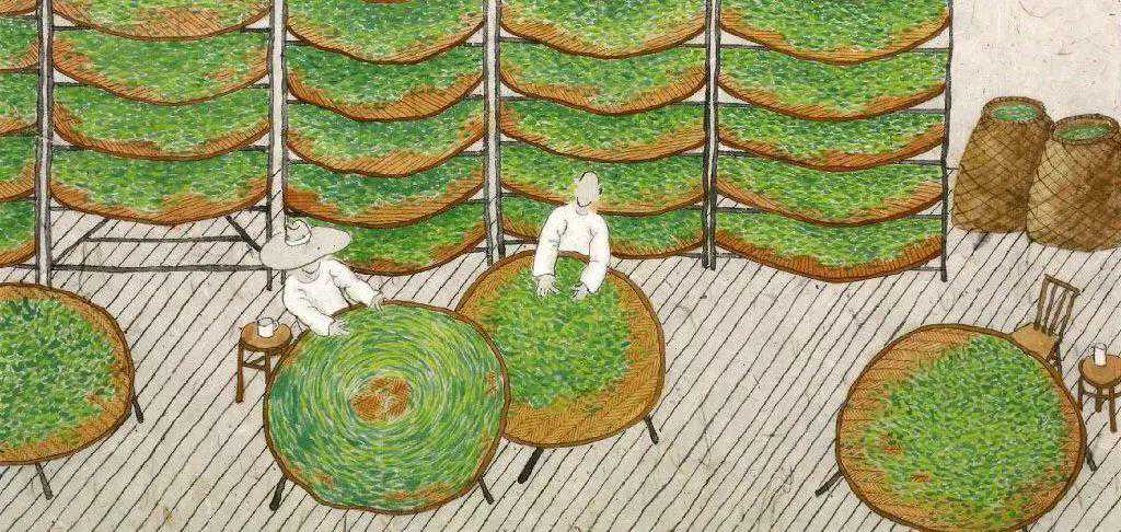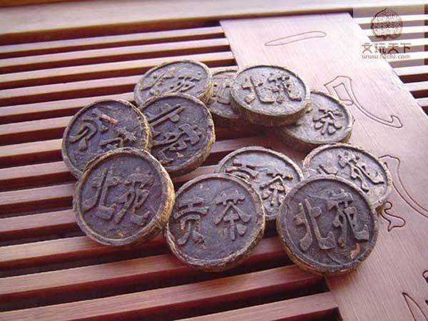 这是贡茶制作的最后一道重要工序,叫做过黄,相对于现在制茶工艺中的烘焙。将压模凉干的茶饼,放在烈火上烘焙,然后过沸水淋浴,反复三次之后,再用文火烘焙,利用柴火烟焙。这个时候,火不能太大,太大容易造成“面炮而色黑”。但同时也不能用烟,否则“香尽而味焦”。烟焙时间长短根据饼茶厚薄而定,饼厚者需要10~15天,饼薄者6~8天即可。过黄之后,茶饼必须“过汤上出色。出色之后,当置之密室,急以记扇扇之,则色泽自然光莹矣”。只有经过沸水淋浴,茶饼颜色才自然光亮,晾干之后成而真正的贡茶。