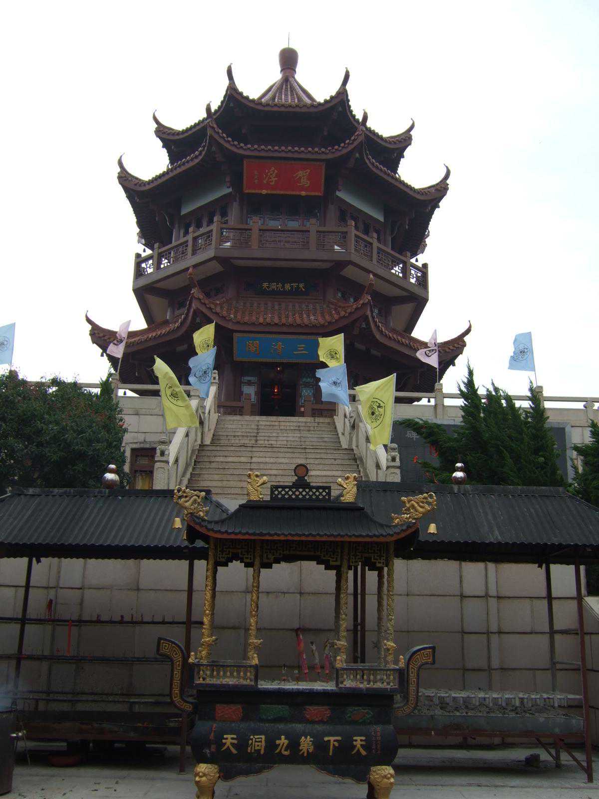 林屋山山顶的灵佑观(3)规模虽然小,但仍有道士住持,曾于2005年9月重建。(4)道观中心有一座名为驾浮阁的三层五阶的楼阁。它的第一层(二楼部分)挂着一块写着“三清阁”的匾额。穿过匾额进到里面,下沉的一楼部分供奉着三清像。楼阁的边上还有一个小的进香空间,并挂着“苏州市吴中区道教教会太湖西山林屋洞灵佑观管理委员会”的竖匾。