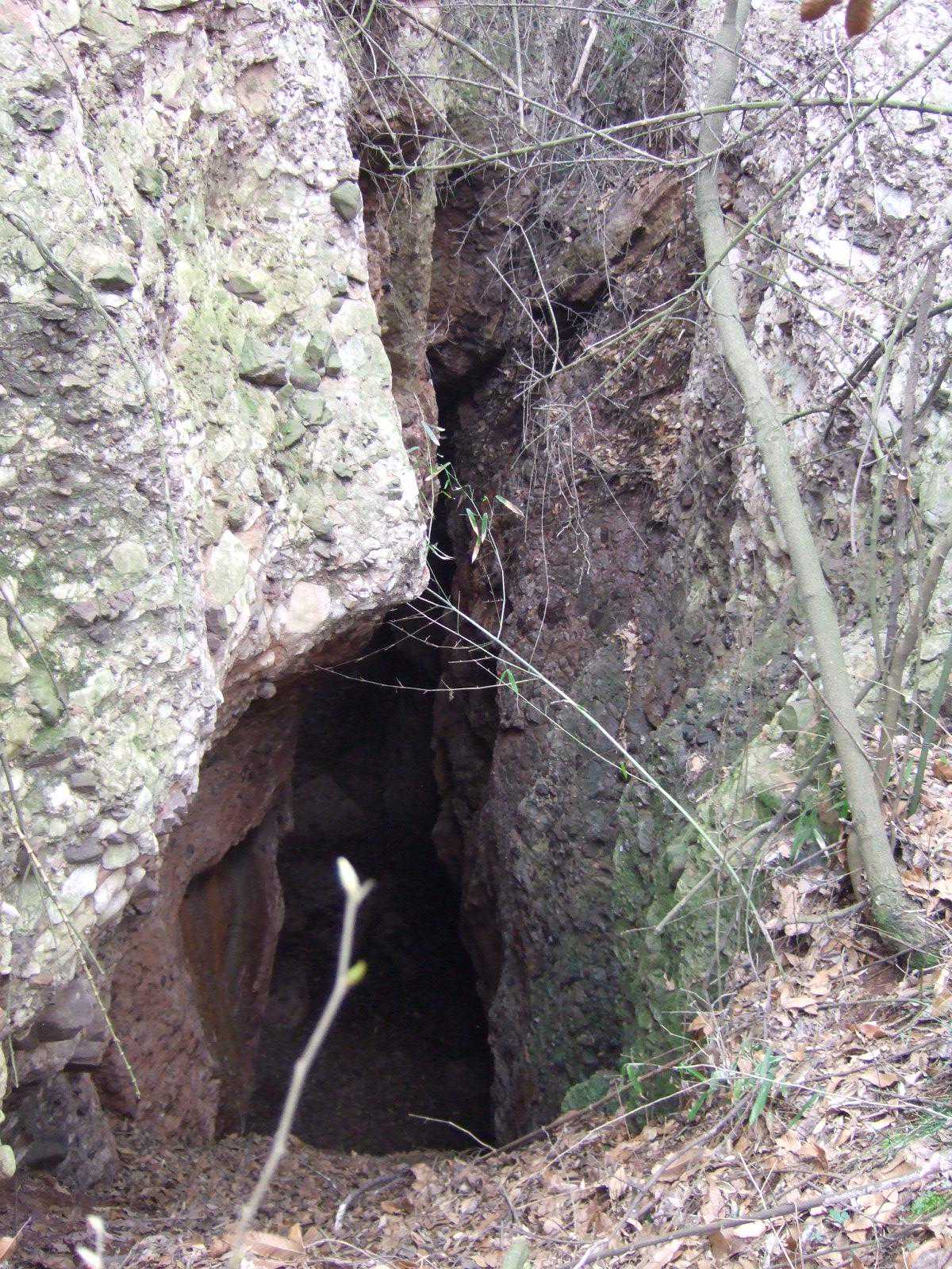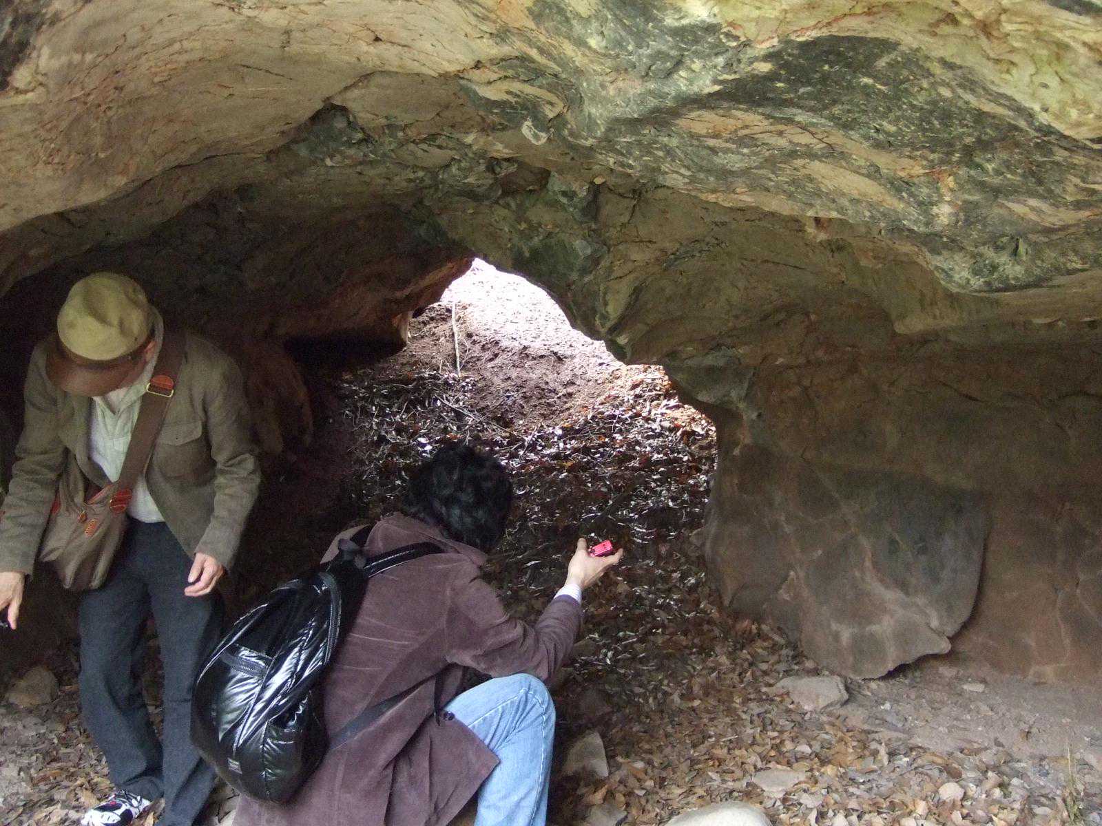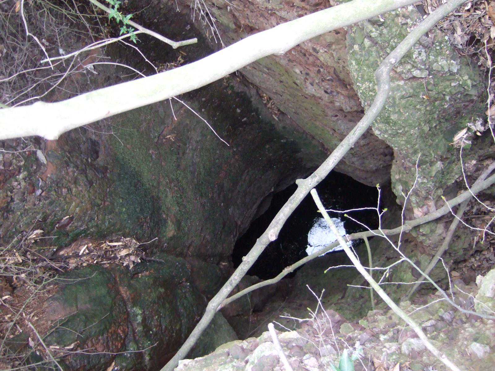 洞窟确实是在岩石区,但岩石并非呈隆起状,加上杂草覆盖,所以非常难认。洞口垂直于山坡向下开口,无法进去考察。里面似乎有两个洞,向其中一个扔了一块石子,发出了“扑通”的声响,应该是有积水(*照片26)。另一个洞大约深五米,底部为一般的地面(*照片27)。洞口宛如将山坡纵切开,通往另一世界的大门一样。