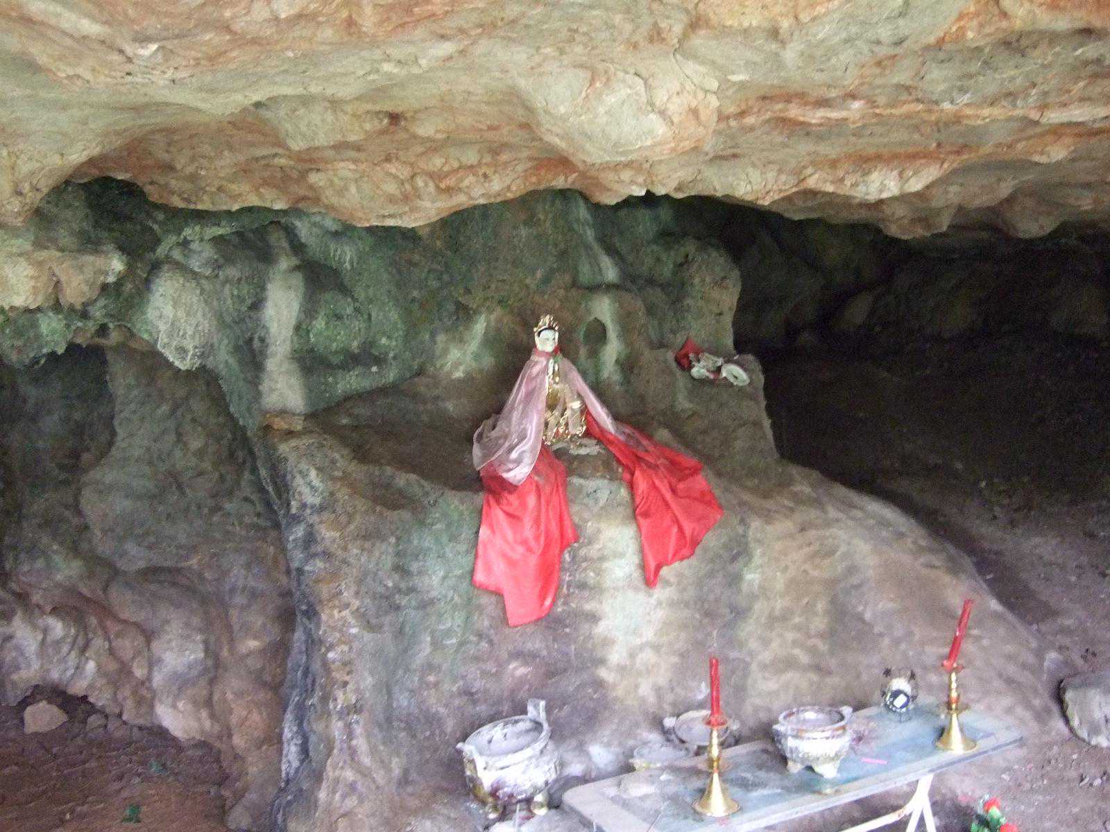 离开三官洞又向前走了一会,果然左手侧看到了柏子洞(*照片23)。这是三个洞中最大的一个。洞口左右开阔,洞口边上刻着“柏子洞”的文字。文字的下面还能看见“常宝子”三字。可能是刻写“柏子洞”作者的名字,并不知道是什么人。洞内分成两块空间,一间供奉着一尊比较新的观音像(*照片24),另一间大约有两间车库这么深,往内还连着小洞,但人进不去,所以不知道究竟有多深。与前两个洞窟不同的是柏子洞内湿气较重,地面呈黏土状。