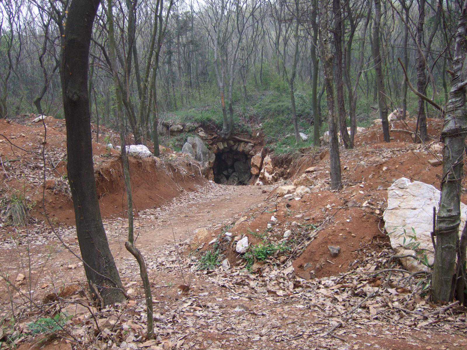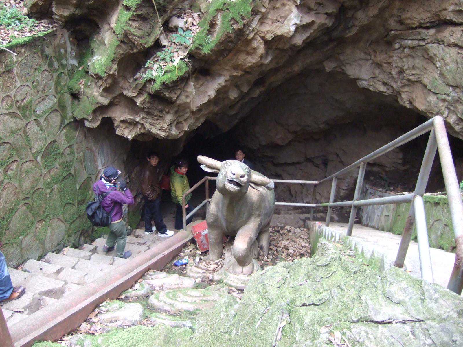 金牛洞位于大茅山东南面的山麓上。穿过景区的大门,左转向下走几分钟,就能看到嶙峋的褐色岩石。那一带有很大片的地面下陷(*照片31)。沿着很陡的台阶向下,首先在左手边的石壁上刻着“金牛洞奇传”的文字,接着到了祭祀财神的地方。继续往下走,看见洞口的前面放置着一只雄赳赳的牛雕像(*照片33)。洞口的上方刻着“金牛洞”三字。洞内虽然没有闭锁,但也没有点灯,所以没有手电筒就无法进到深处。洞内高约3m,进深约30m。后面似乎还连接着人无法通过的小洞。