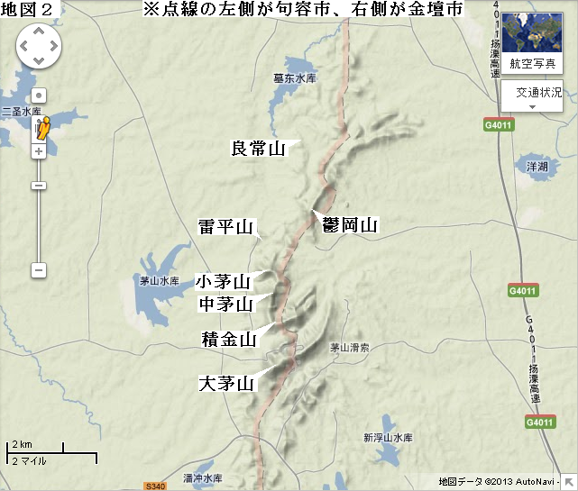 最后还有一件想要考证的事。虽然我们使用陶金独自考察后制作成的地图来到了良常山,但良常山的位置在一般的地图上都没有标记,茅山道院与乾元观的道士们以及问路过程中遇到的当地住民们都没去过良常山,所以大多数人是不清楚山的具体位置的。也就是说良常山的位置不是众所周知的信息。笔者这里所写的都是以“老虎洞=良常洞”为前提,可最终我们考察的这座山是否就是良常山呢?因此下面还想对良常山以及良常洞的位置做一个考证。