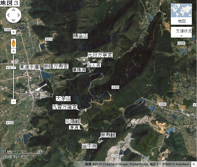崇禧万寿宫建造在积金山(*地图2)的西南山麓下。现在茅山的道观正在急速推进再建工程,崇禧万寿宫在是其中之一。笔者在2012年8月到访茅山的时候这里还只是一片平地,到了2013年3月21日的时候已经有很多建筑物被建造了起来,一副即将竣工的景象。茅山道院的办公室也早早地搬到了这里。现在重新再看茅山道院道长杨世华与潘一德道长的名片,他们名片上的地址也是崇禧万寿宫。所以今后这里应该会作为茅山道院的总部吧。根据《茅山道教志》的记载,崇禧万寿宫的遗址在一九九六年修建东进水库时被淹没了(14),现在的崇禧万寿宫是在原址东边一点的地方重建的。