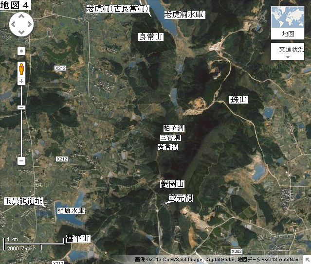 笔者虽然不是很清楚陶金是如何确定良常山的位置的,但从《真诰》与《周氏冥通记》中的记载来看,那座山确实像是良常山。第一、《真诰》的陶注“自小茅山后去,便有雷平、燕口、方嵎、大横、良常诸山,靡迤相属”(卷十一3b),此处至少可以知道良常山是乾元观所在的大横山(郁冈山)北面的一座山。第二、《真诰》中茅君的神启有中提到“良常北垂洞宫口直山领”(卷十一7b),这个也与老虎洞在山的北侧,且不在山脚而在靠近山顶山坡上的位置相一致。第三、同样在中茅君的神启中有“良常山对穴口东视小山之岭”(卷十一15b)这样的描述,老虎洞位于山北朝东(水库侧)的山坡上,洞口也是朝东而开。并且,通过谷歌的卫星地图(*地图4)来看,如果没有杂草,从洞口看出去,在水库的对岸可以看见一些小山。第四、《周氏冥通记》中的陶注有“良常在朱阳东北十里许,山连冈亦至此间”(卷一14b)的描述,从卫星地图(*地图4)可以看出老虎洞水库在玉晨观遗址(原朱阳馆)的北北东方位,用百度地图测量直线距离约4km。因此陶弘景步测的“东北十里许”从方位和距离来说,位于老虎洞水库西面的山是良常山的可能性很高。