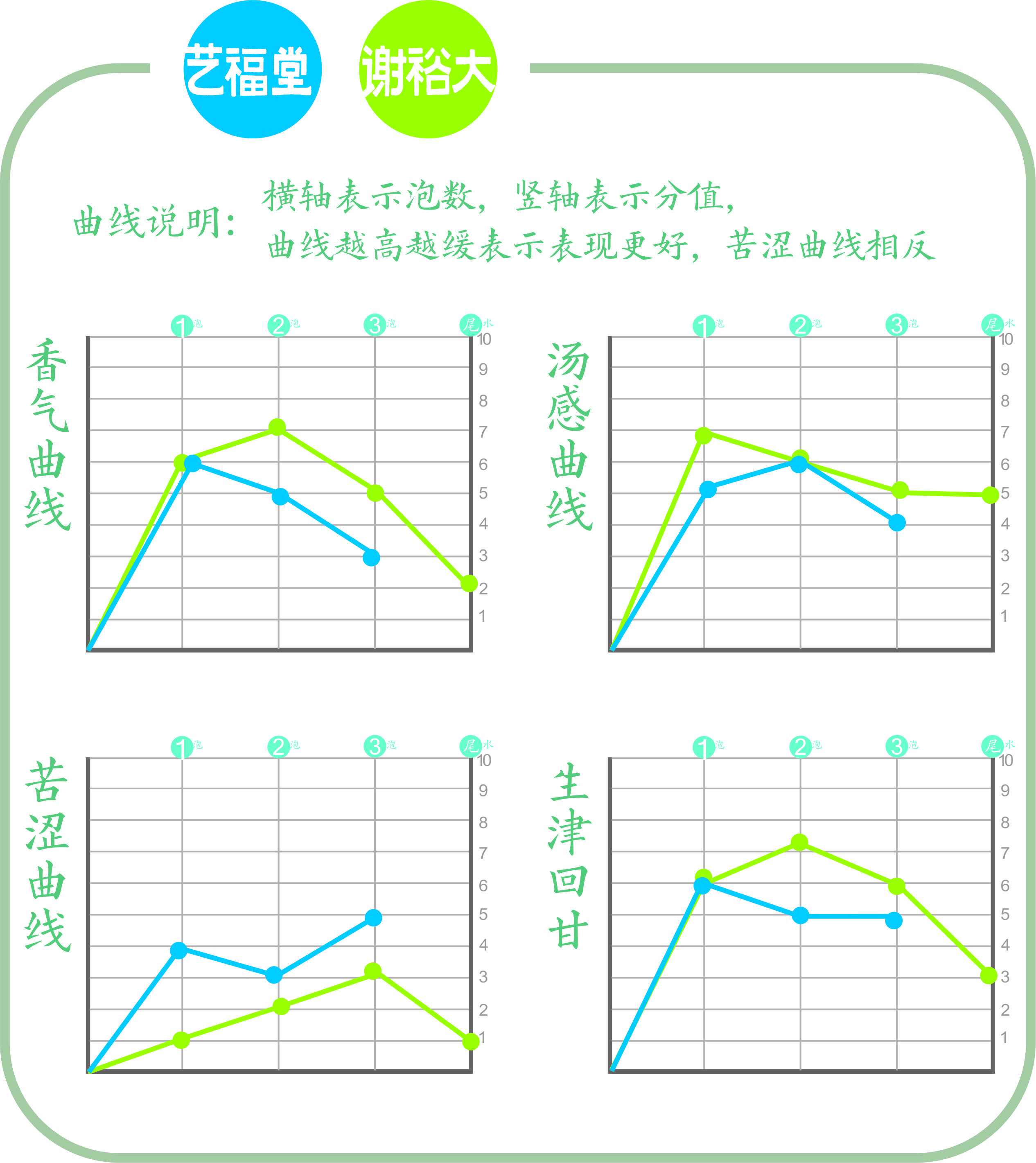 主要指标图示解析:曲线很清楚,黄山毛峰在各项指标上都有超出,香气更浓郁,汤感更稳定,苦涩更低,体感更强烈。
