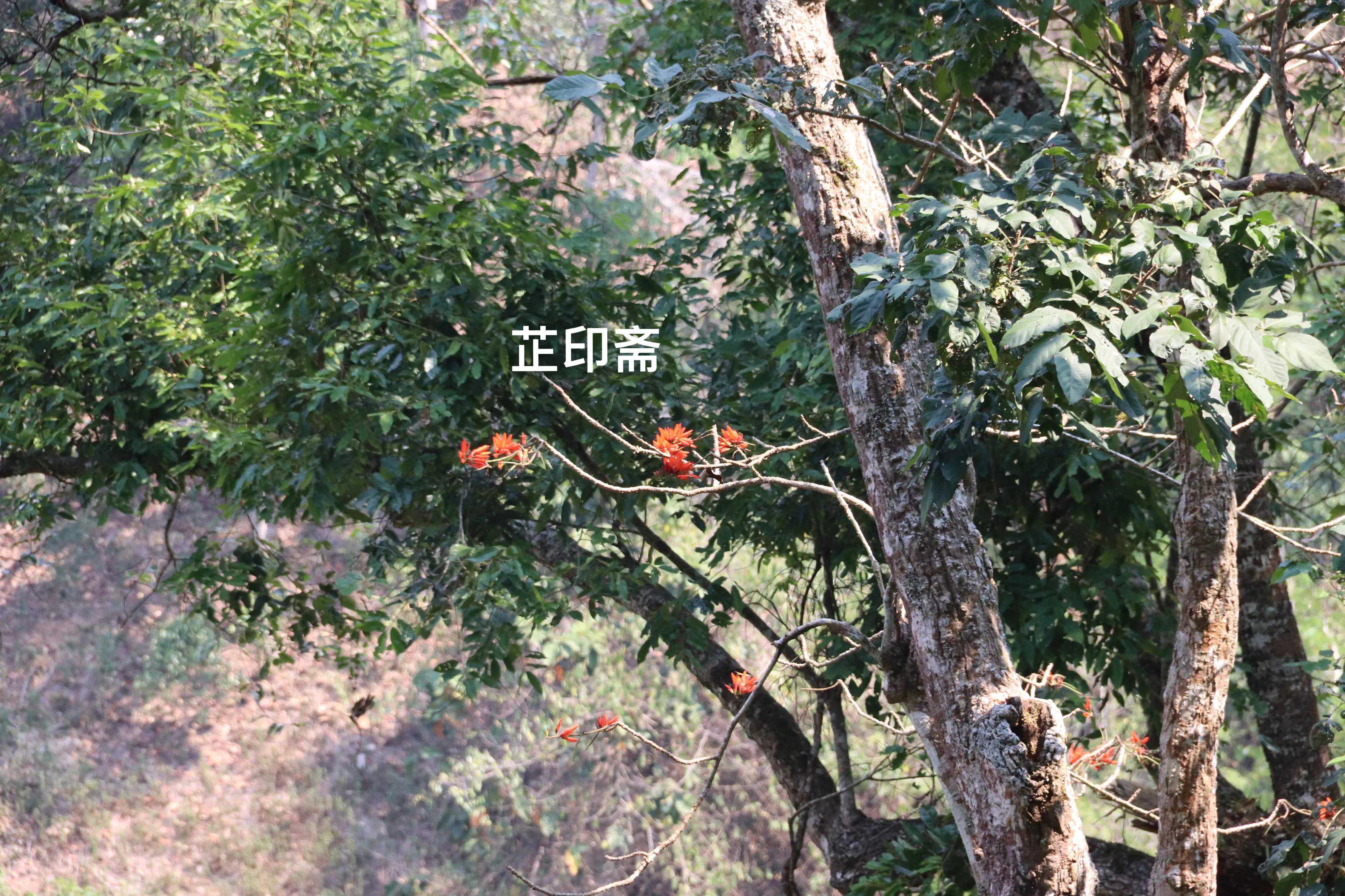 整个地势属于两山一峡谷,河流在山坳里一直流,流向远方,周边岩石峭壁上的大榕树,树围很大,笔挺挺的直冲天际,参天大树上有寄生的藤蔓,最下层就是各种蕨,各种芭蕉,各种野菜,各种野花。