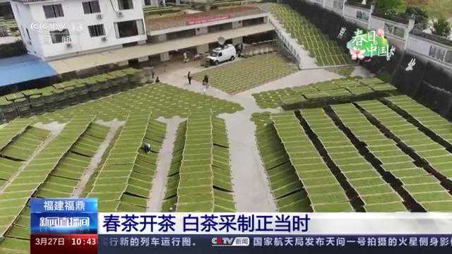 福建台记者杨扬:我现在是在宁德福鼎市的鼎白茶叶晒场。这里从空中看非常壮观,这绿油油的一大片的茶芽让空气都显得特别水灵灵的。白茶是我国6大类茶当中,制作工艺看似较为简单的,但是每一个环节在细微处见功夫,特别不容易。