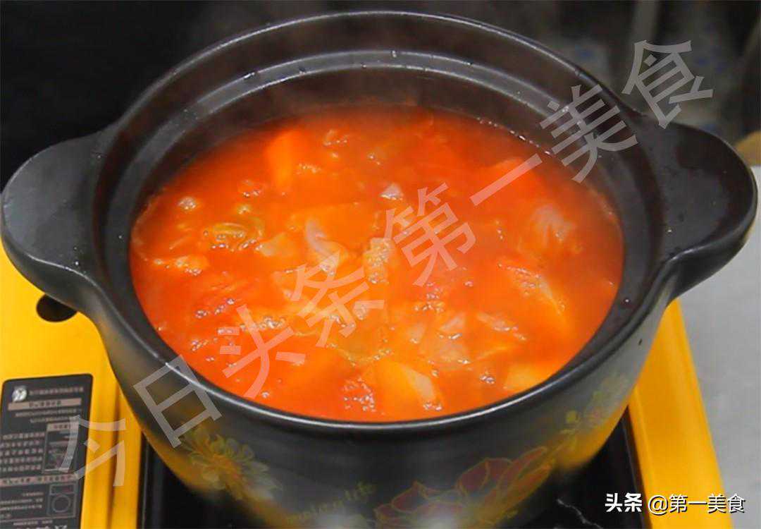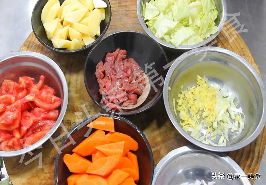 2.开始烹饪:锅内烧油,放入葱,姜快速翻炒出香味,加入牛肉粒煸炒几下,倒入西红柿和洋葱,快速翻炒出西红柿的汁水,倒入半勺番茄酱翻炒均匀后,加入适量的清水或高汤,倒入土豆块,胡萝卜块和包菜,连菜带汤一起放入砂锅中,盖上锅盖,开小火煲20分钟左右。
