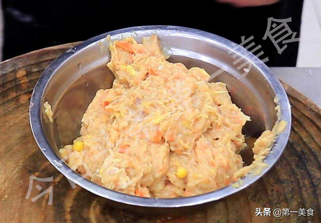 1.准备鸡肉泥:切点大葱片、生姜片、胡萝卜丝,准备适量的鸡肉末,和切好的葱、姜、胡萝卜一起倒入料理机中,再放一些玉米粒,口感更加香甜,打入一个鸡蛋,倒入适量的料酒,加入一勺食盐,一勺胡椒粉,一勺鸡精,再加入两勺淀粉增加馅料的黏性,打成肉泥备用。