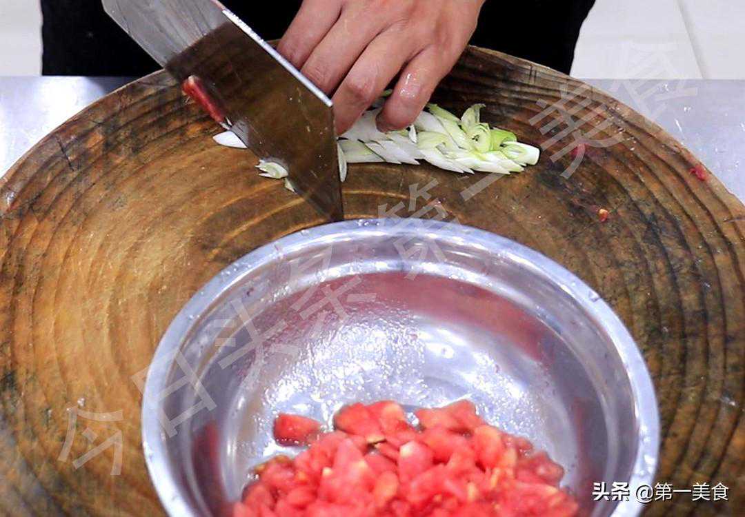 准备西红柿一个,锅内烧水,水烧开以后把西红柿放锅中烫一下,烫一下比较容易去皮,捞出西红柿撕去外皮,切成小块备用。