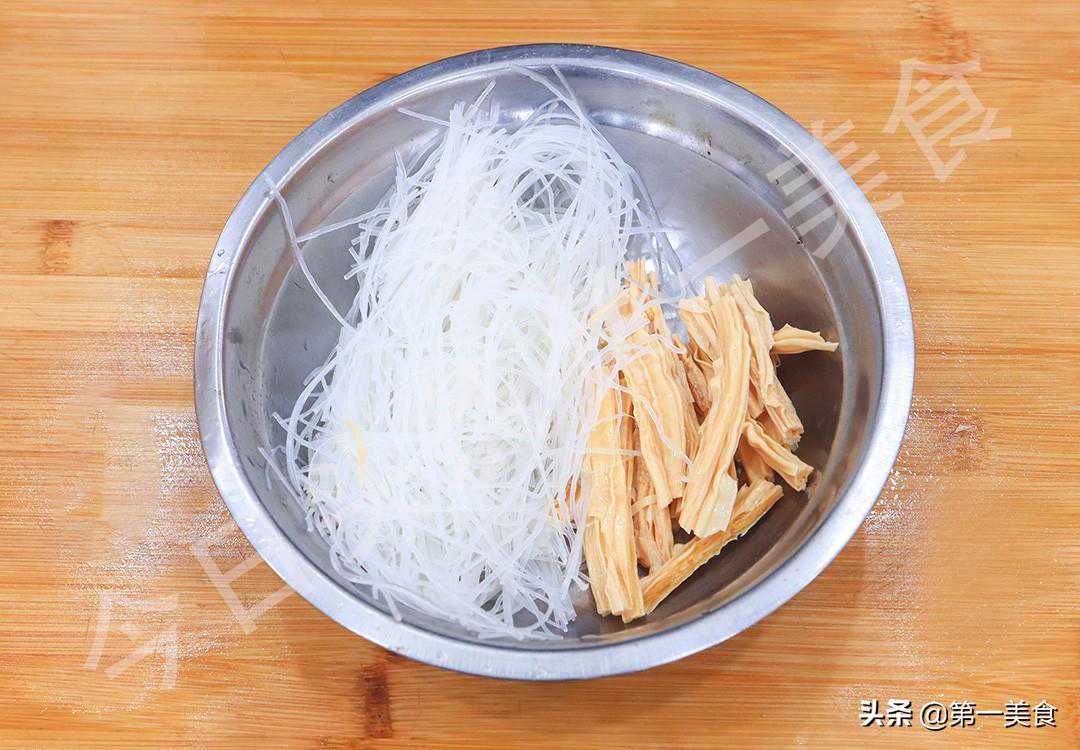 准备一些腐竹、粉丝放入清水中泡发,腐竹一定要用凉水泡发,吃着才劲道而且不容易煮烂,泡发以后切成小段备用。