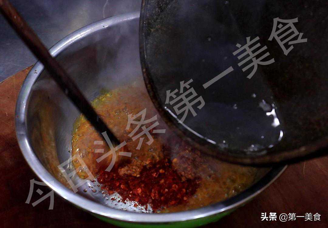 另起锅烧热,把牛油放进去熬化,熬制没有腥味再放入葱段、姜片,开小火炸出里面的葱姜油,葱姜炸干、炸成金黄色时挑出来不要,关火把热油浇在辣椒面上激出香味,做成牛油辣子。