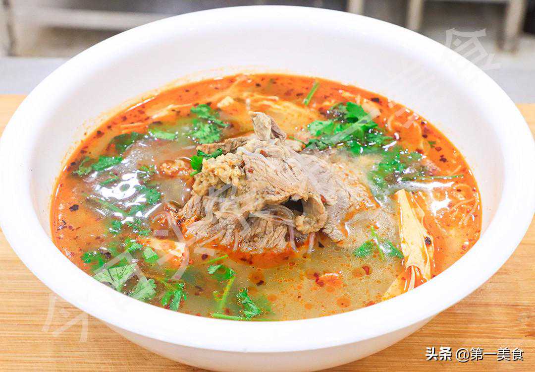 2个小时以后,牛肉能用筷子轻轻穿透说明已经煮熟了,把牛肉捞出来放在一边晾,晾凉后顶着纹理切成牛肉片,把牛肉片、粉丝和腐竹一起放入牛肉汤中煮熟,盛放在碗中。